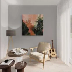 This piece showcases a harmonious blend of colors including shades of black, brown, white, and green, complemented by soft hues of blush, pink, purple, and orange.