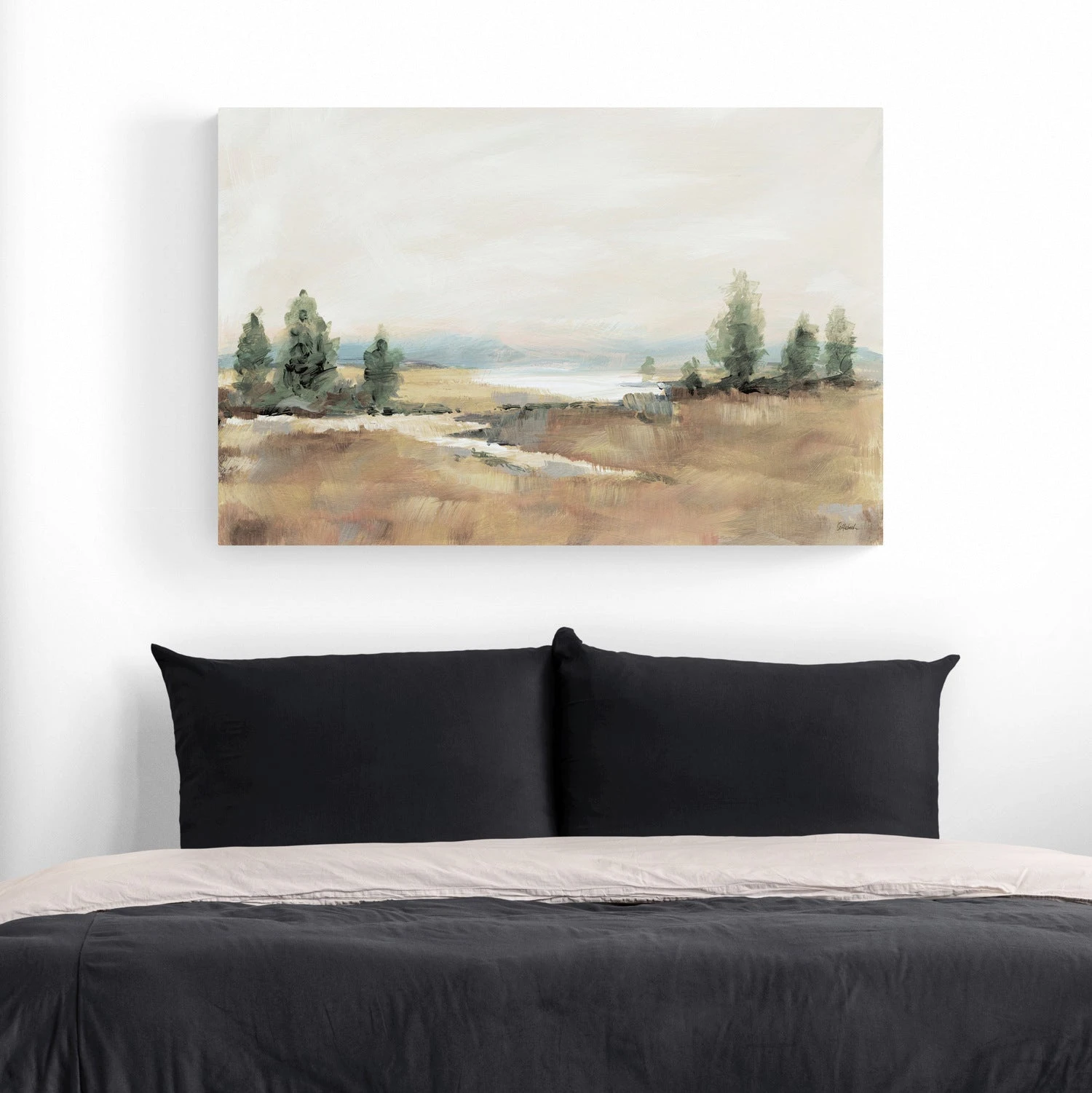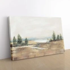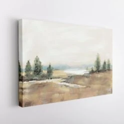 Amity Pond by Sue Schlabach is a peaceful landscape canvas art print that captures the tranquility of a serene natural setting. With muted earthy tones, soft greens, and pale blues, this artwork portrays a calm pond surrounded by open fields and trees, evoking a sense of stillness and natural beauty. The gentle brushstrokes and neutral palette make this piece a perfect addition to any space, bringing a calming, rustic charm to the room.