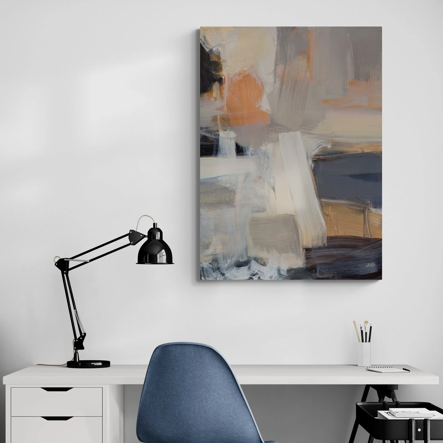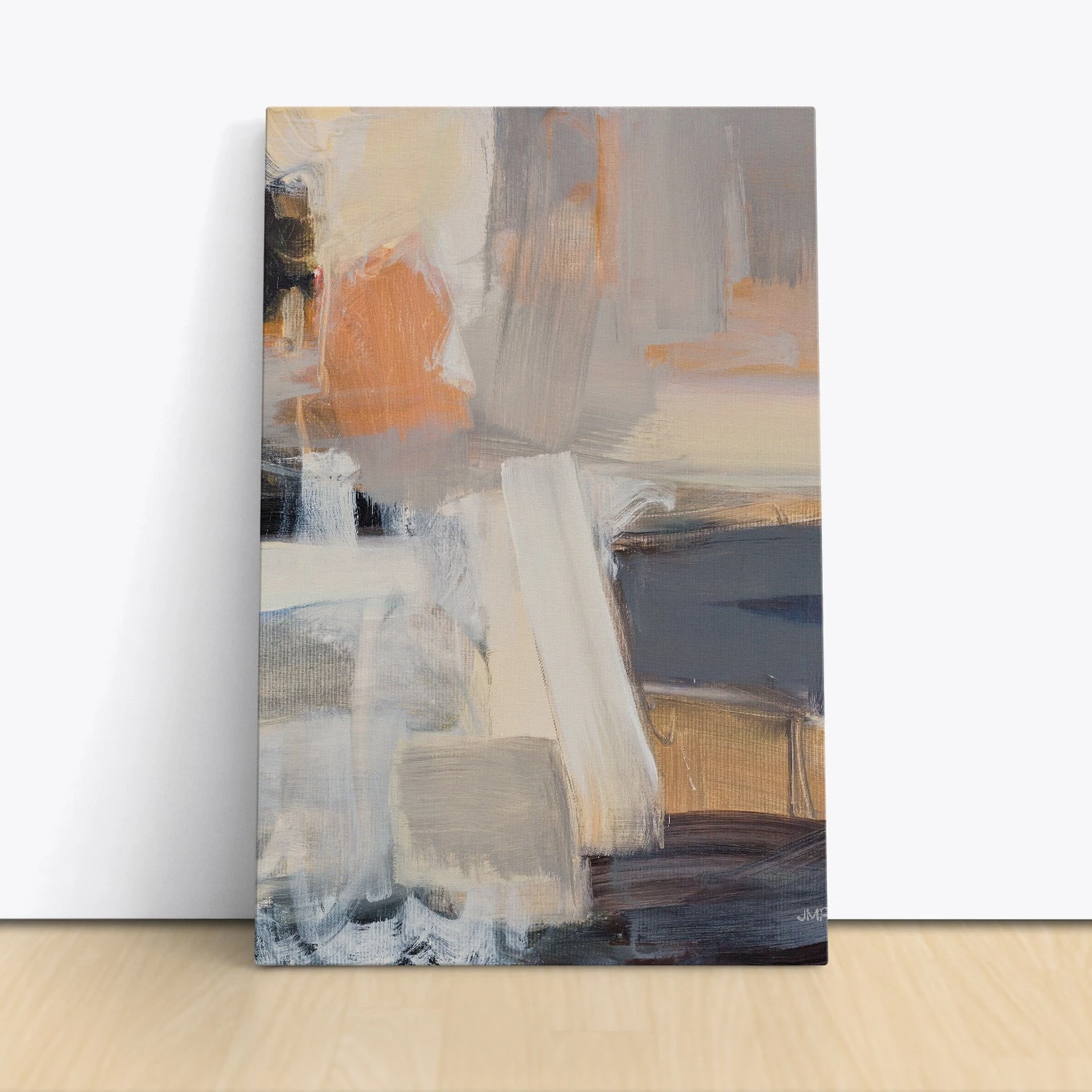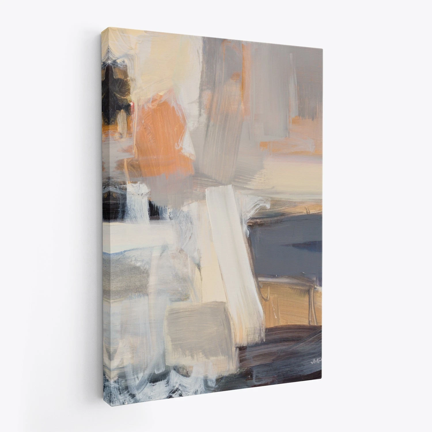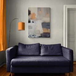 Beale Street Abstract by Julia Purinton is a striking abstract canvas art print that blends warm and cool tones with expressive brushstrokes. This piece features a mix of earthy browns, soft greys, muted oranges, and hints of deep navy, creating a harmonious composition that is both dynamic and calming. The abstract design evokes an urban aesthetic, making it a perfect fit for contemporary and modern interiors.
