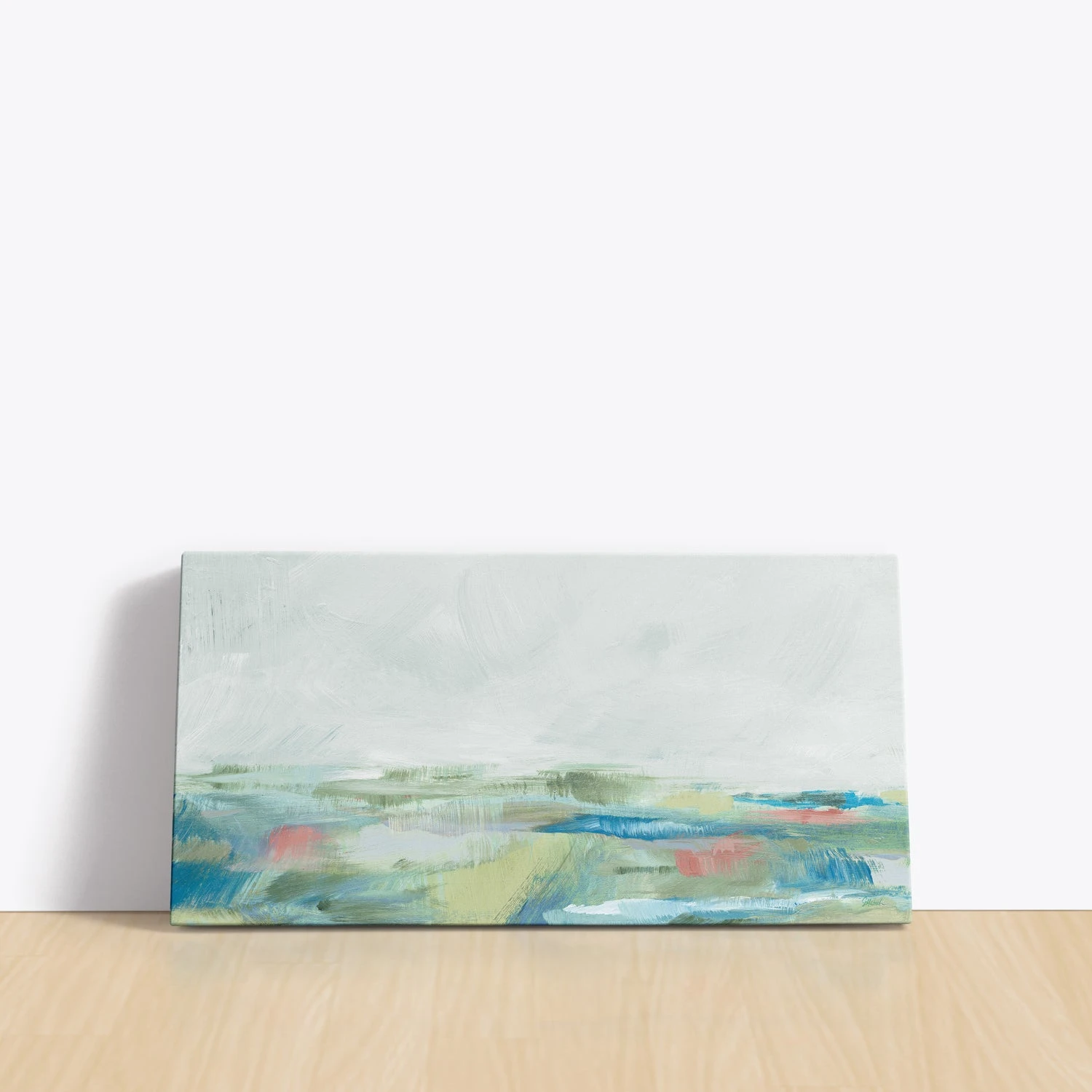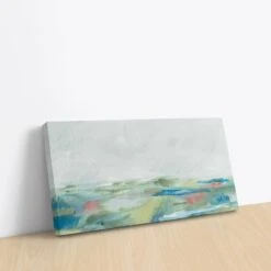Blue Horizon I by Sue Schlabach is a serene canvas print featuring an abstract landscape. With soft, muted tones of blue, green, and subtle pops of coral, this piece evokes a tranquil horizon and the peaceful expanse of nature. Perfect for adding a touch of calm and sophistication to any space.