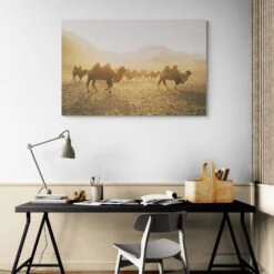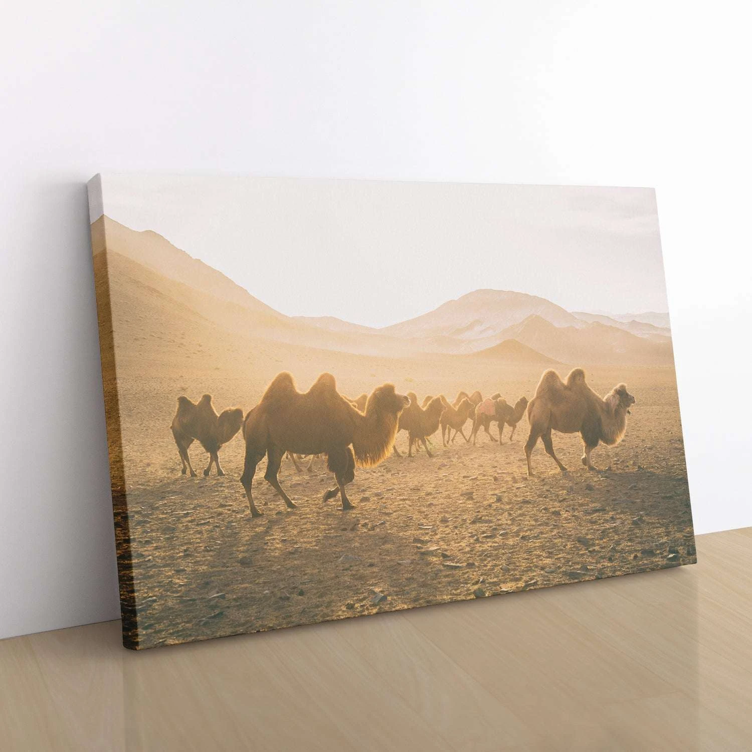 A pale golden light bathes a group of wild camels as they travel through the desert, illuminating the animals and enhancing the scene’s brightness. The vast desert extends far behind them, with sloping hills visible in the distance.Â