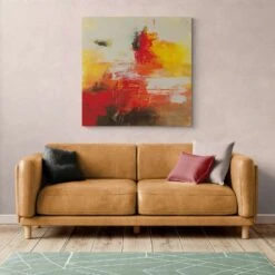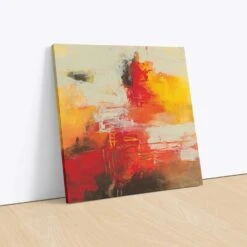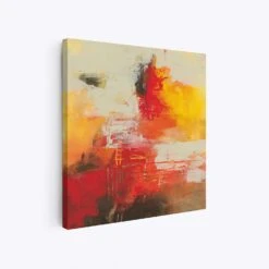 Introducing ‘Change of Season’ by Jan Griggs. This stunning piece is an abstract representation of the dynamic shift of seasons. The artist expertly blends a range of warm colors, including beige, black, fire-orange, and red, to create a sense of movement and energy. The yellow accents add a touch of brightness and bring the whole composition together. The print is printed on high-quality canvas, ensuring that the colors remain vibrant and true to the original work. Perfect for adding a modern and contemporary touch to any room in your home, this print is sure to be a conversation starter. Get your hands on the ‘Change of Season’ canvas art print today and experience the beauty of Jan Griggs’ work.