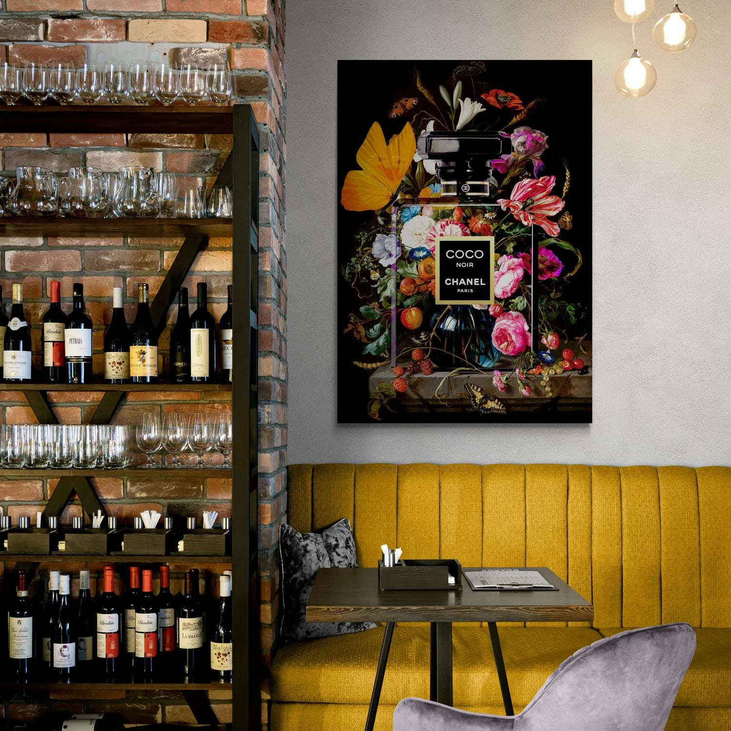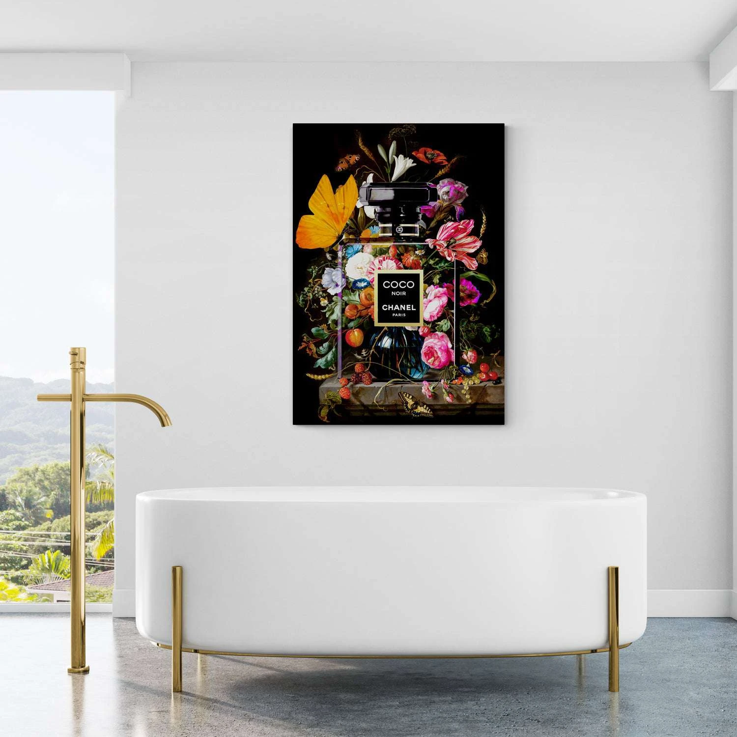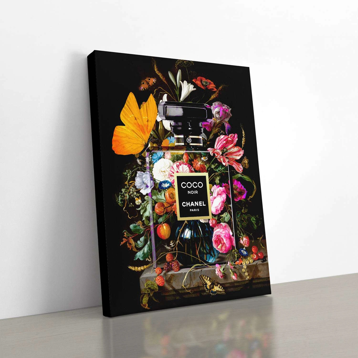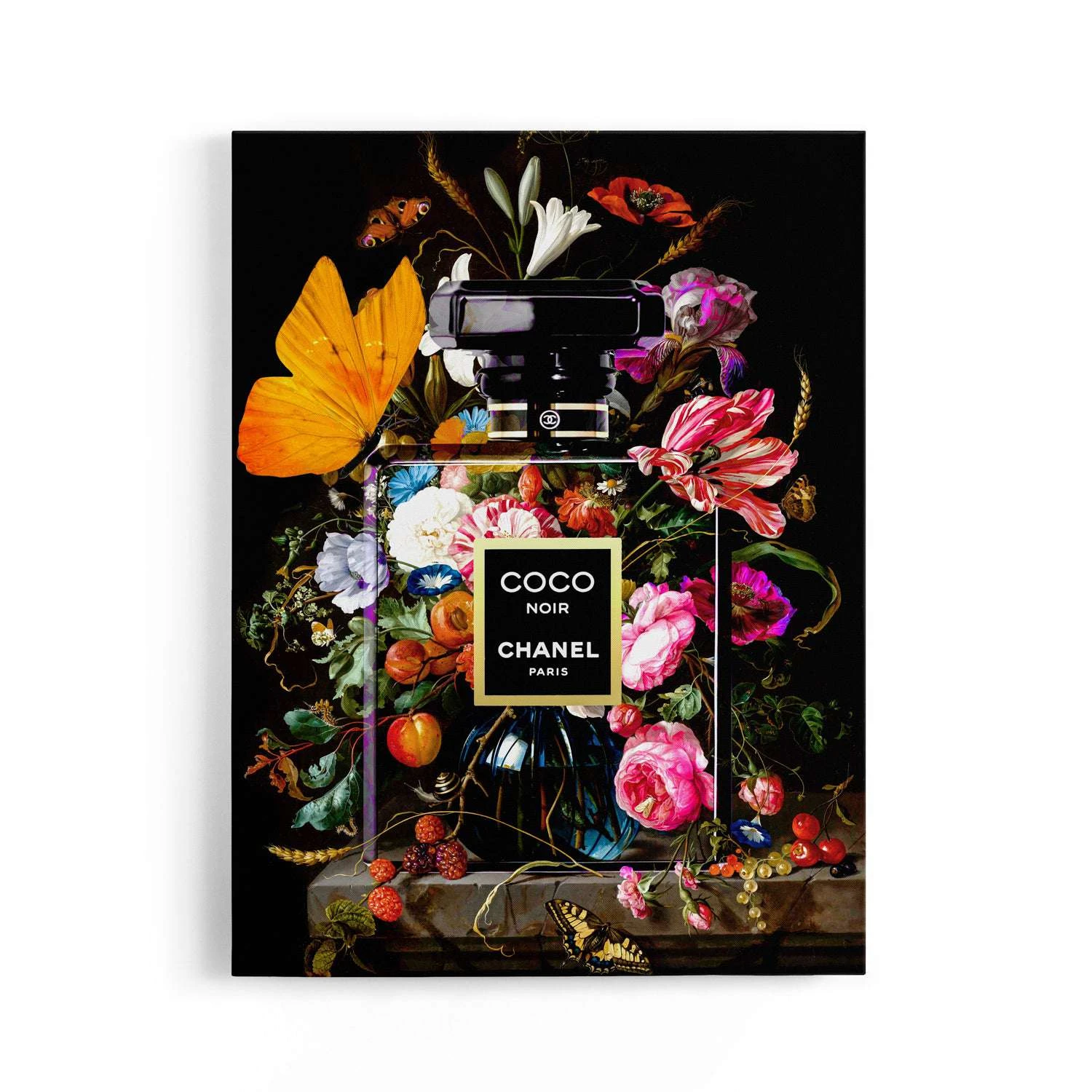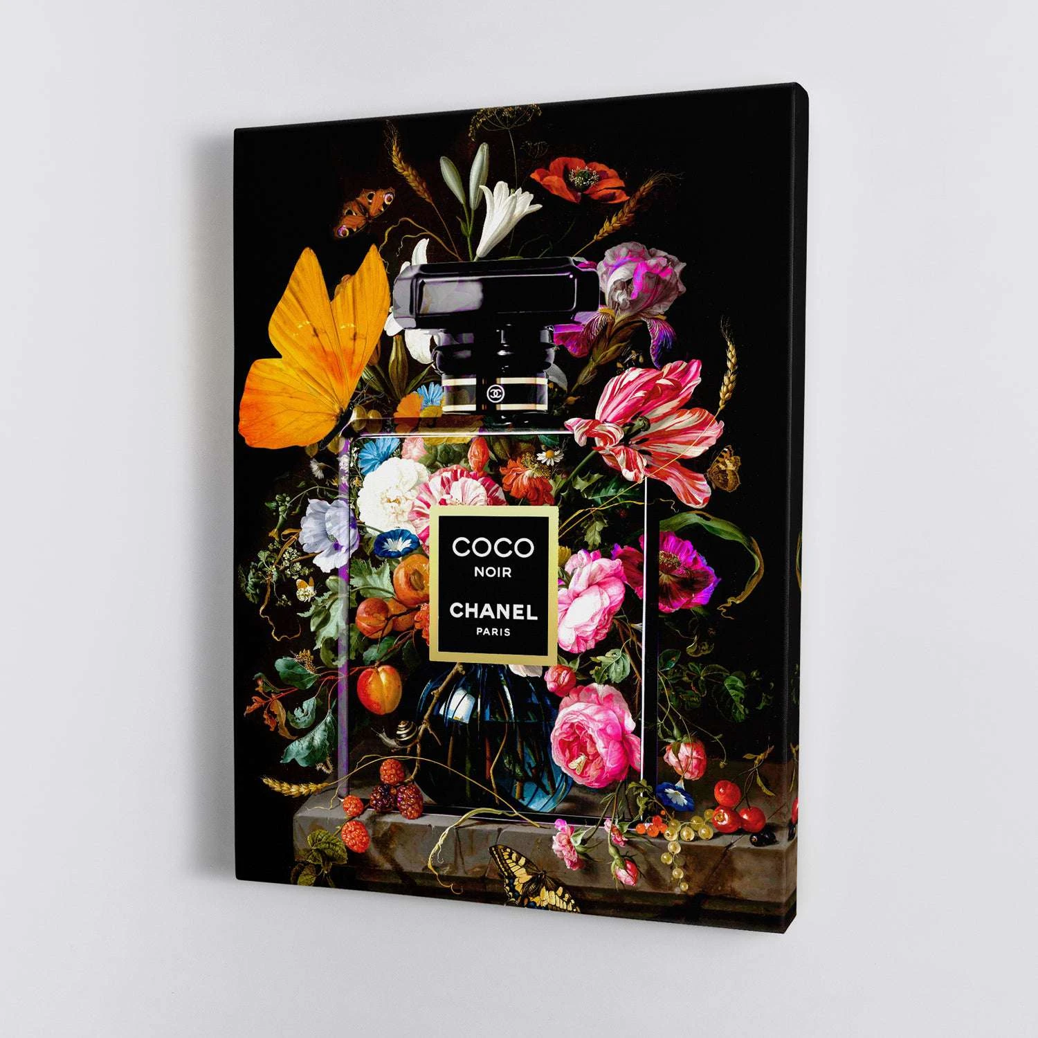 Elevate your space with the Coco Chanel Noir Canvas Art Print, a stunning fusion of luxury, elegance, and timeless artistry. This breathtaking piece reimagines the iconic Chanel Coco Noir perfume bottle, seamlessly blending it with a rich floral arrangement set against a deep, dramatic background. Vibrant flowers, delicate butterflies, and intricate botanical details bring a sense of opulence and sophistication to this masterpiece.