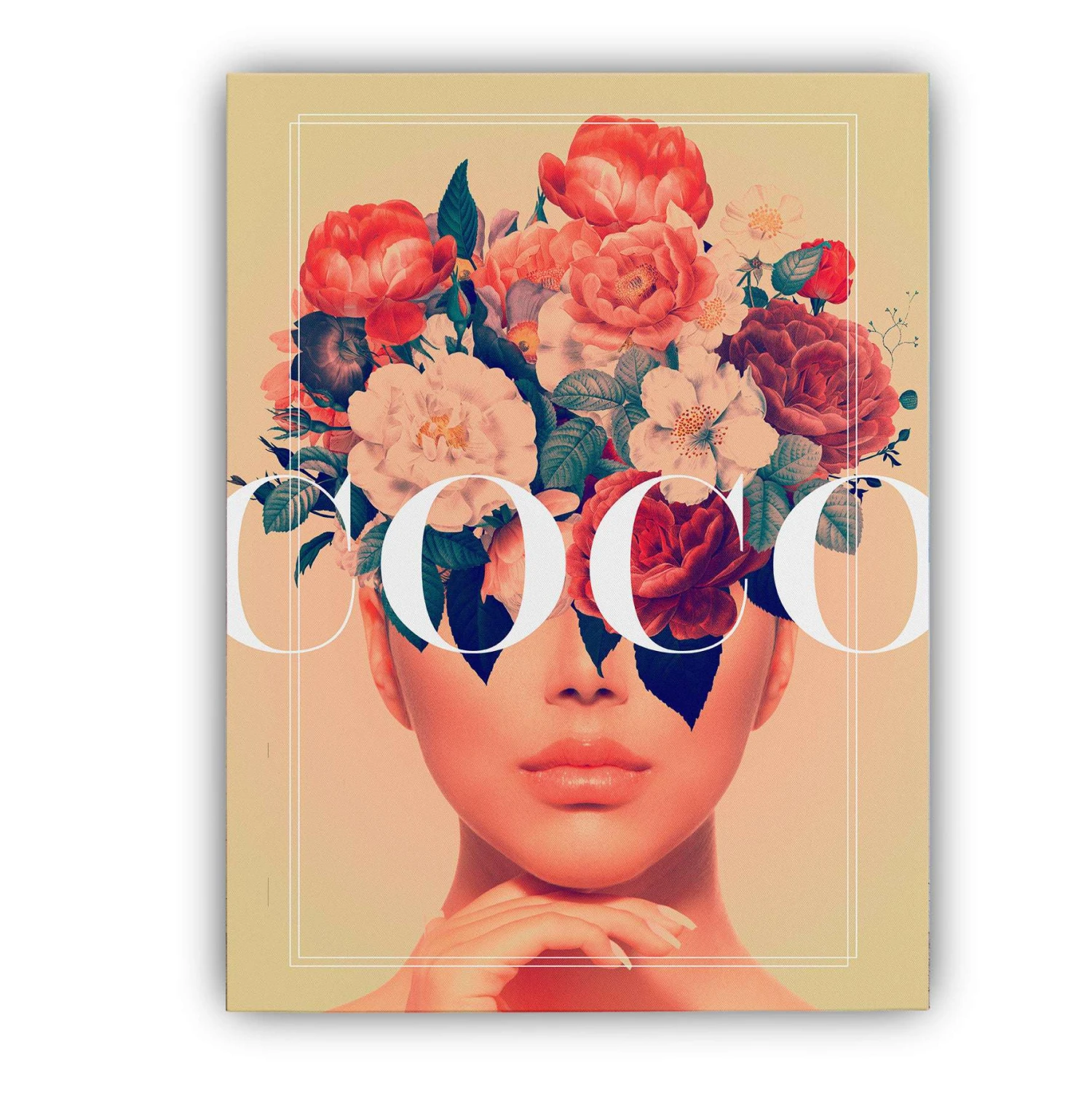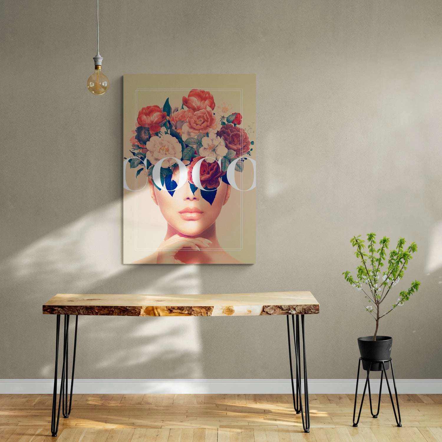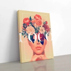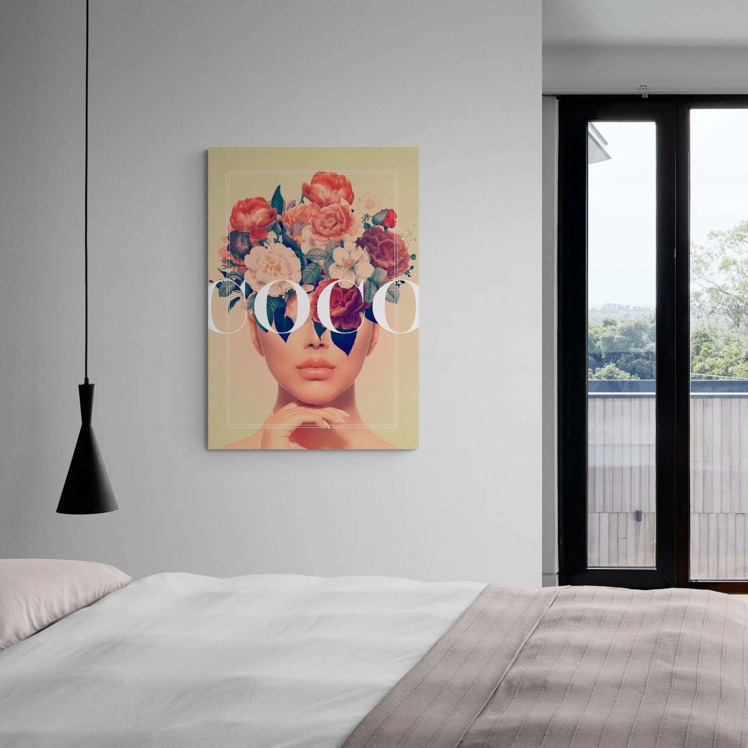 Coco Flowers is a stylish canvas art print with sumptuous flowers and a model in a front profile composition. It will complement your home with its contemporary style.