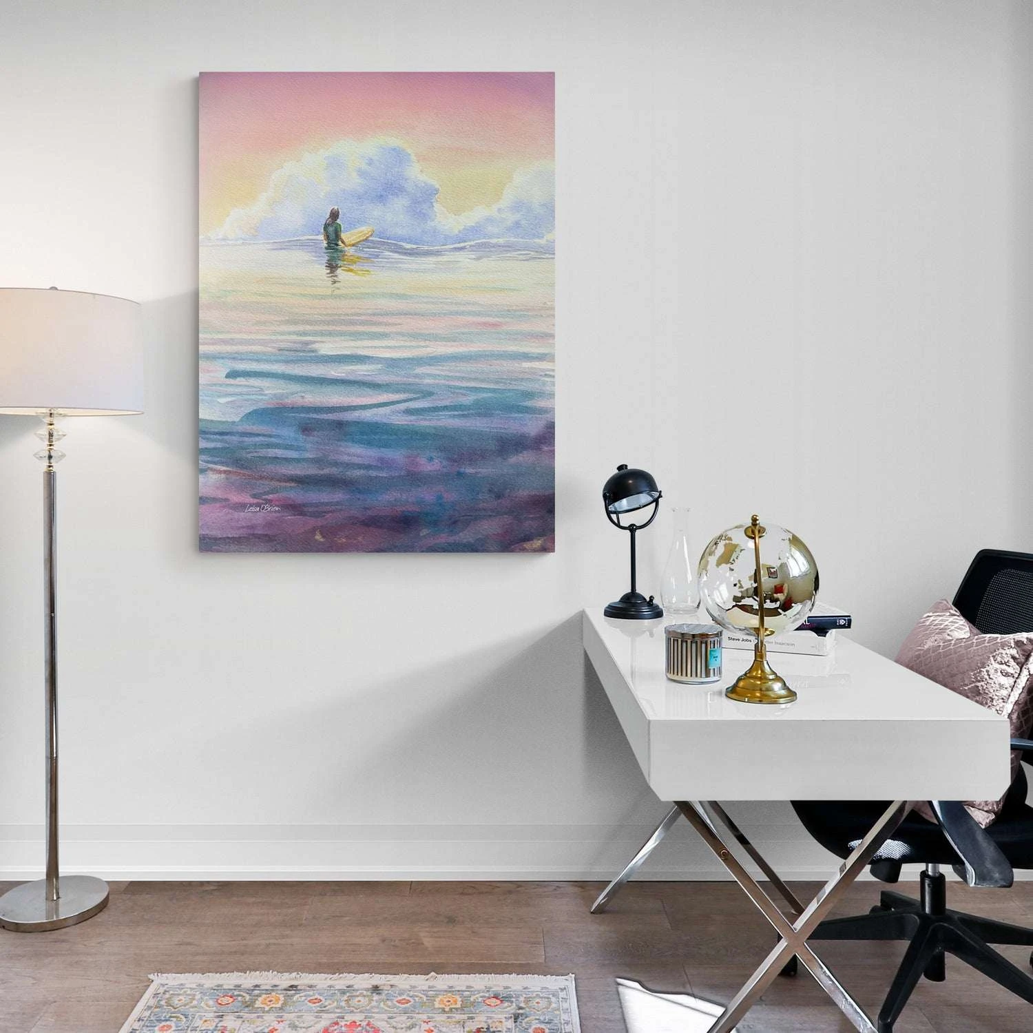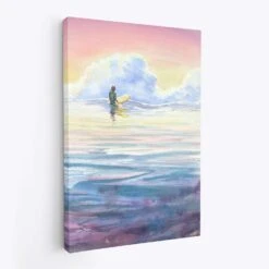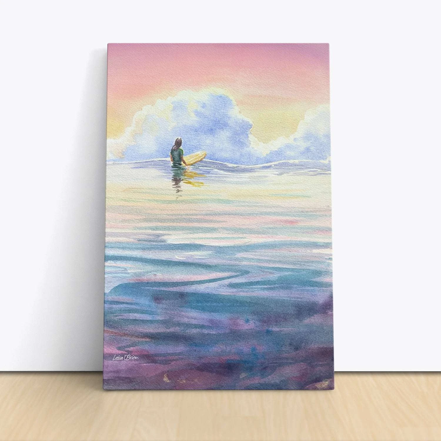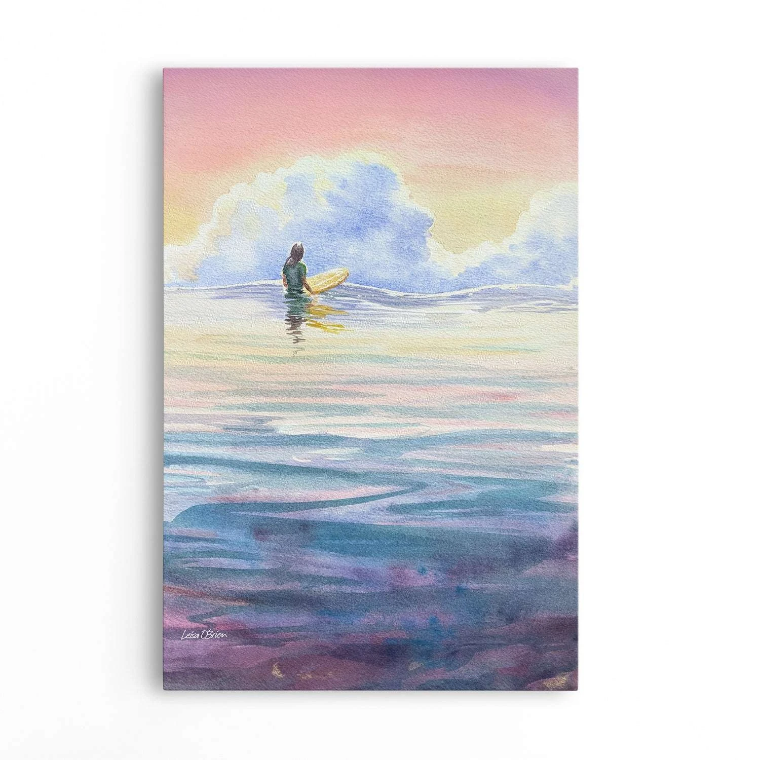 Early Morning Session by Leisa O’Brien. Lisa captures the serene beauty of a lone surfer bathed in the early morning rays, patiently awaiting the perfect wave. The canvas is adorned with a palette of purples, aqua, and blue white clouds, creating a tranquil and dreamlike atmosphere. Lisa’s artistry skillfully conveys the peaceful solitude of dawn, with the subtle interplay of colors reflecting the quiet anticipation of the surfer.