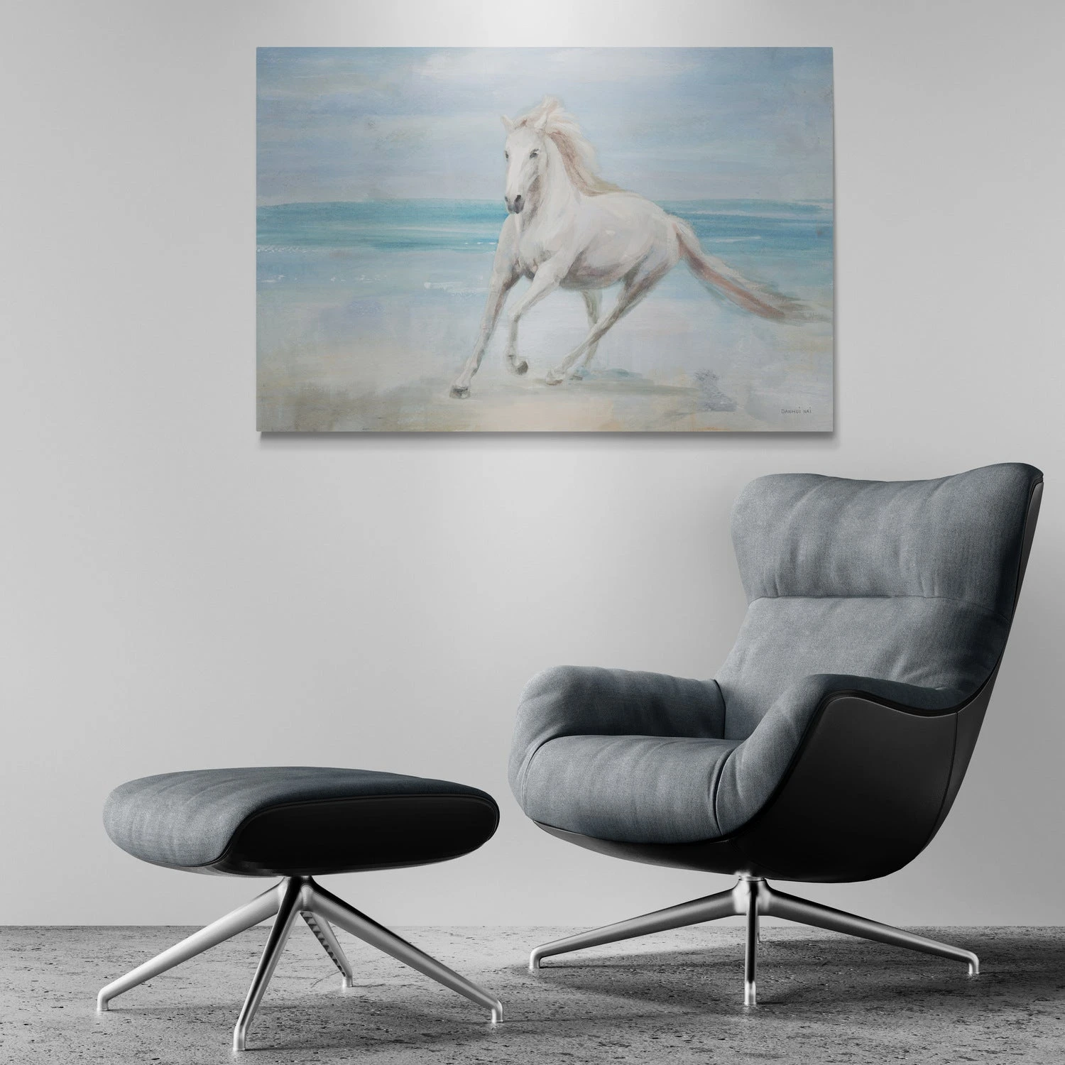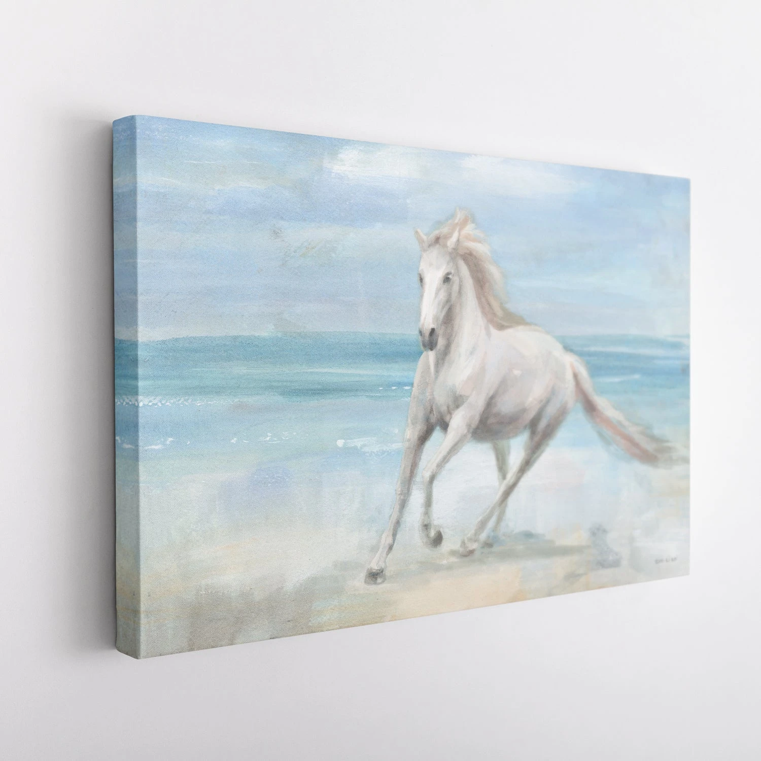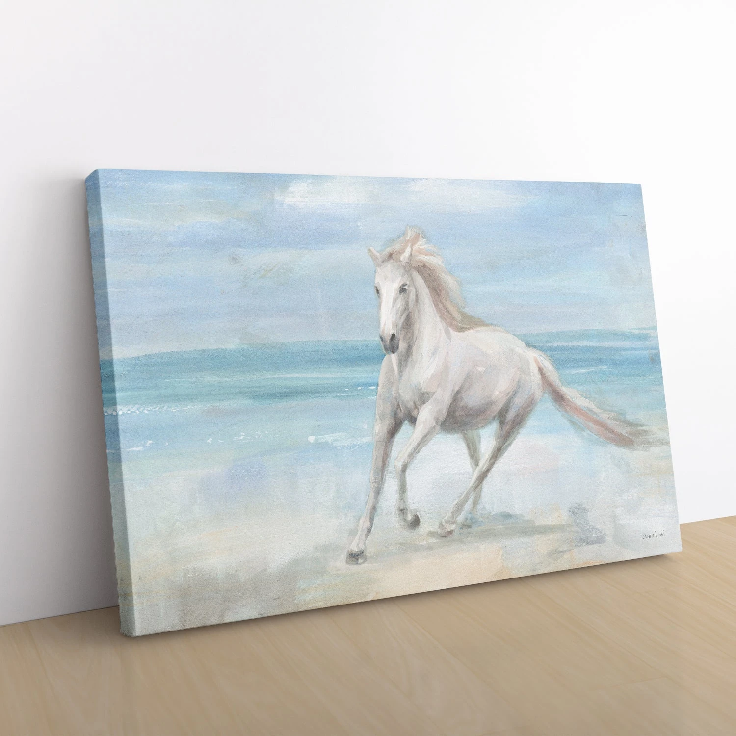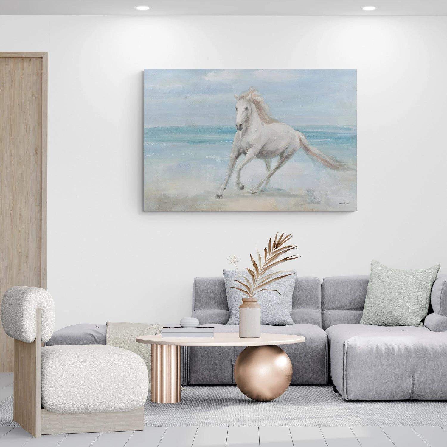Embrace the exhilarating freedom of the ocean breeze with “Gallop on the Beach,” a vibrant canvas art print by the acclaimed artist Danhui Nai. This captivating artwork features a majestic white horse galloping along the shoreline, perfectly capturing the spirited energy and grace of the horse against the serene backdrop of a sunlit beach and rolling waves.