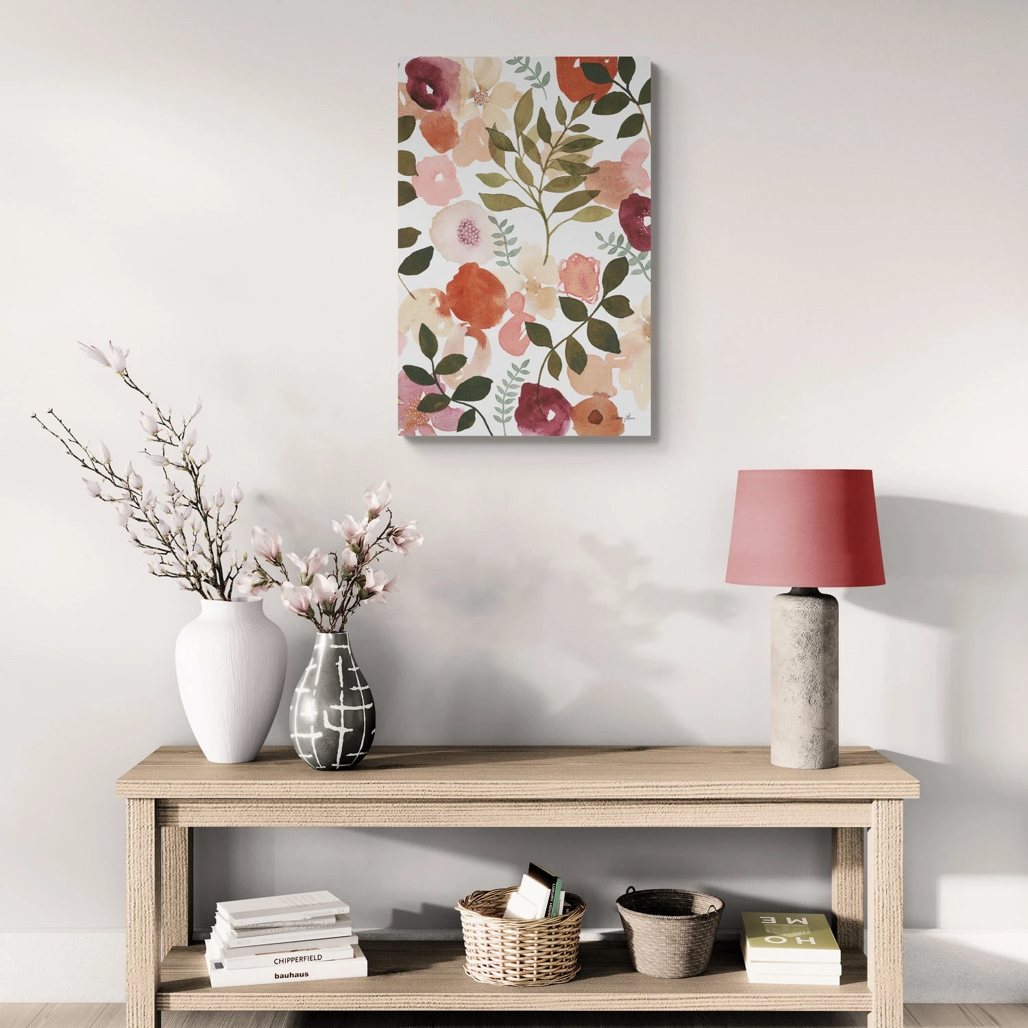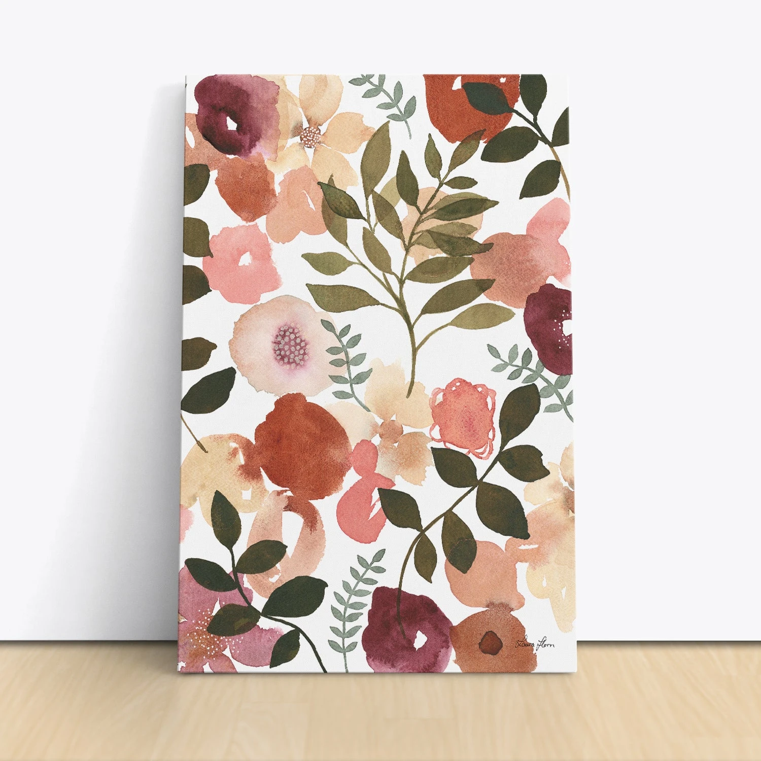Garden Dance I by Laura Horn is a captivating watercolor canvas that embodies the beauty and spontaneity of a flourishing garden. This artwork features a vibrant mix of blush, earthy reds, soft peaches, and deep greens, harmoniously dancing across the canvas. The organic brushstrokes and delicate floral motifs evoke a sense of joy and natural elegance, making it an ideal addition to any living space.