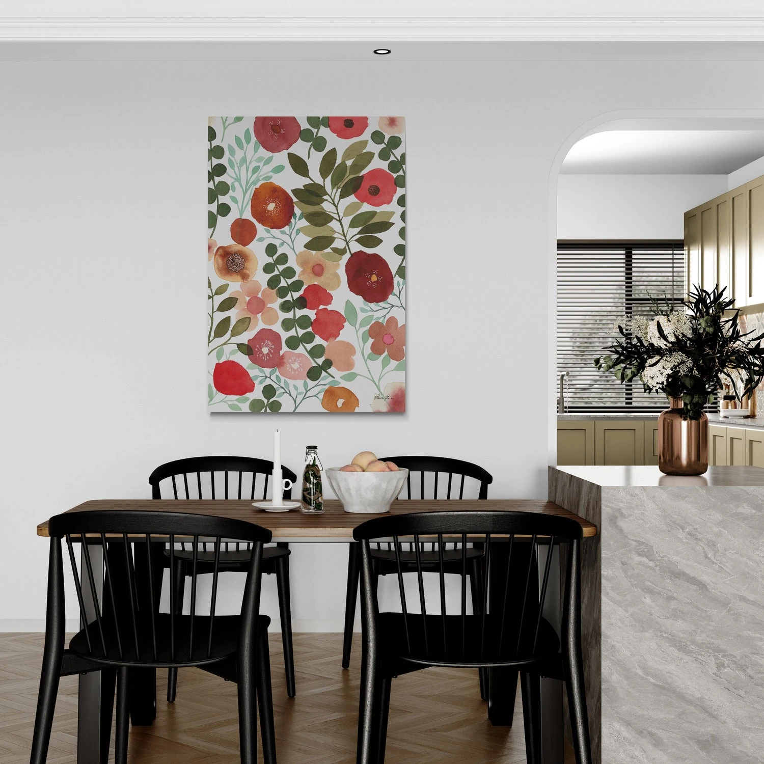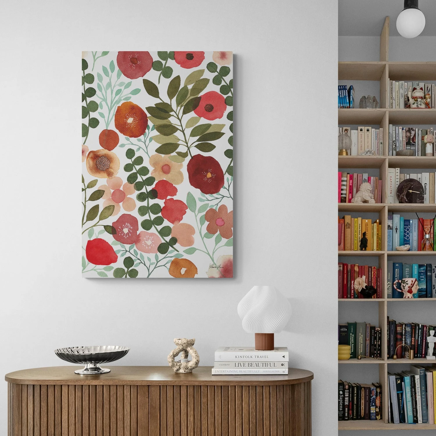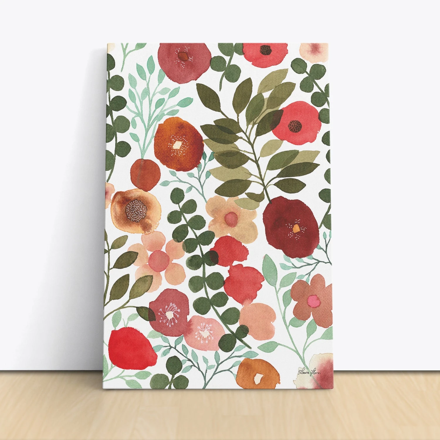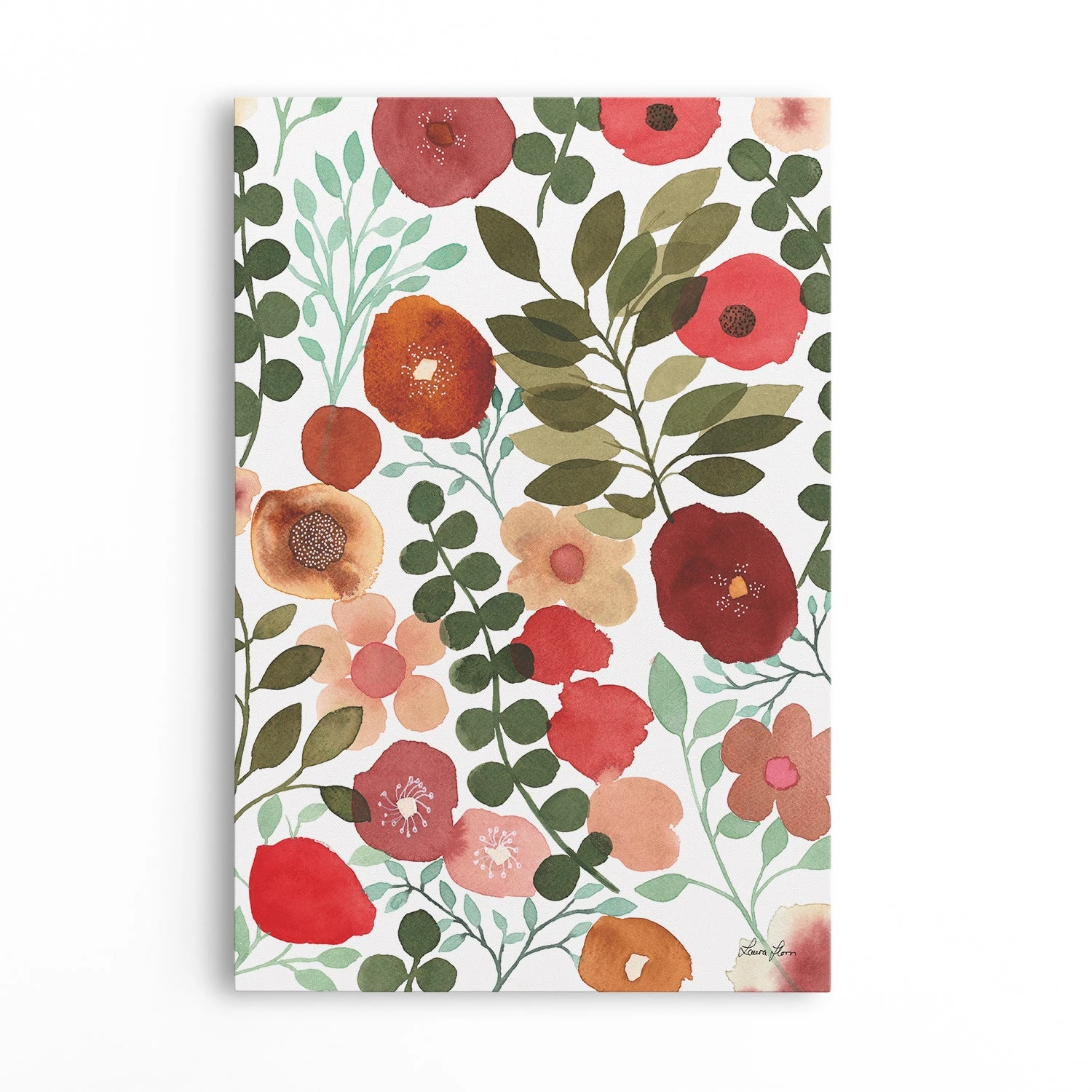 Garden Dance II by Laura Horn is an enchanting watercolor canvas that captures the vibrant essence of a blossoming garden. Featuring a harmonious palette of deep reds, soft pinks, warm oranges, and lush greens, this artwork invites viewers into a world of natural beauty and lively rhythm. The flowing brushstrokes and diverse floral motifs create a dynamic composition that radiates warmth and joy.