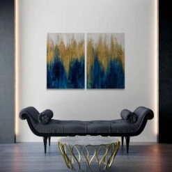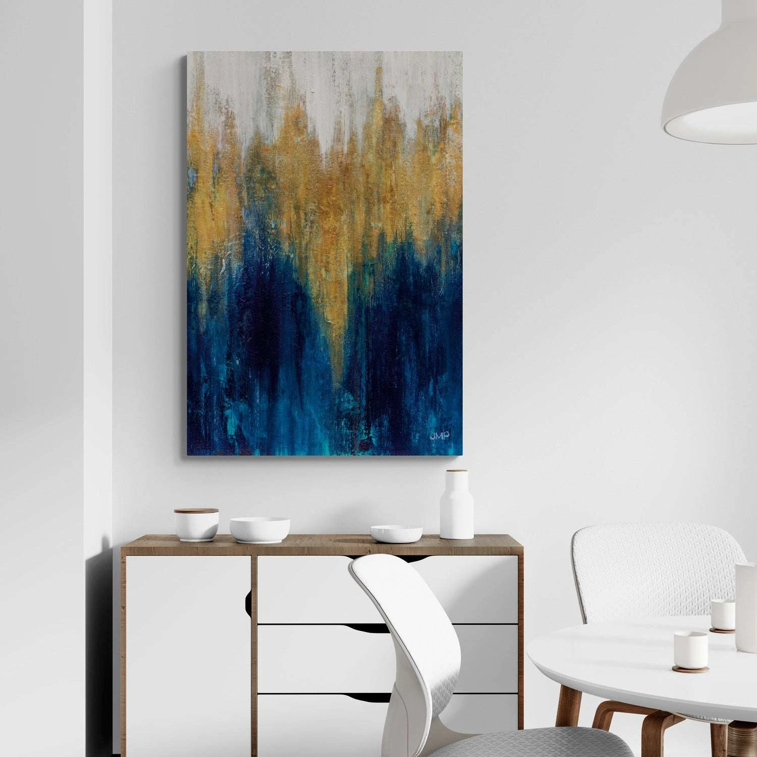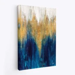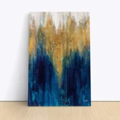 The canvas art print by Julia Purinton titled “Glimmer I” features a striking abstract composition. The artwork uses a vibrant palette of deep blues and rich golds, creating a dynamic interplay of colors. The top of the canvas starts with a light, almost white background, which gradually transitions into the textured golden tones that cascade downwards.