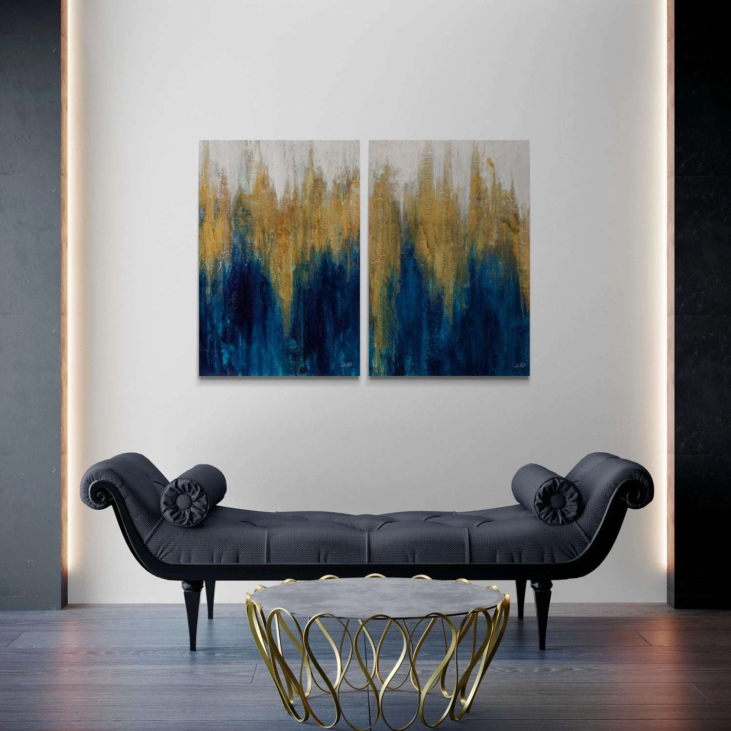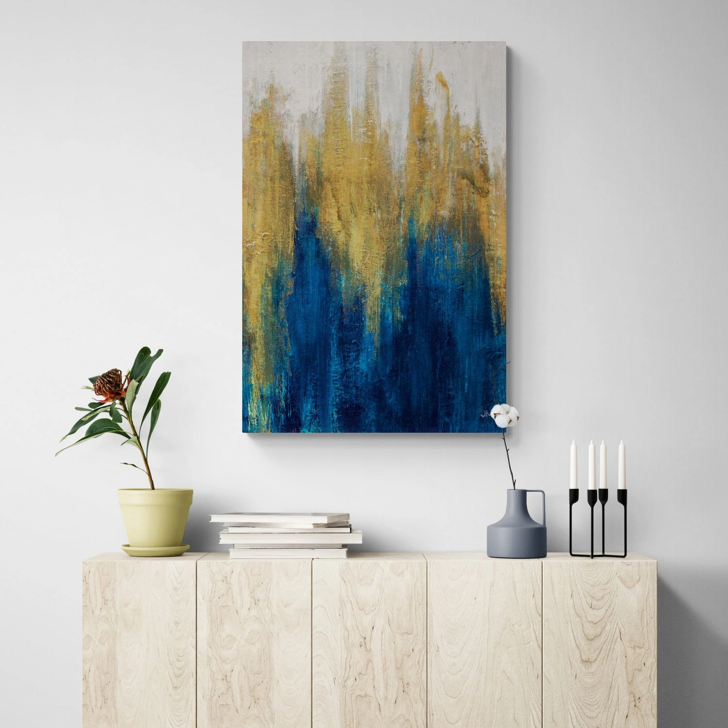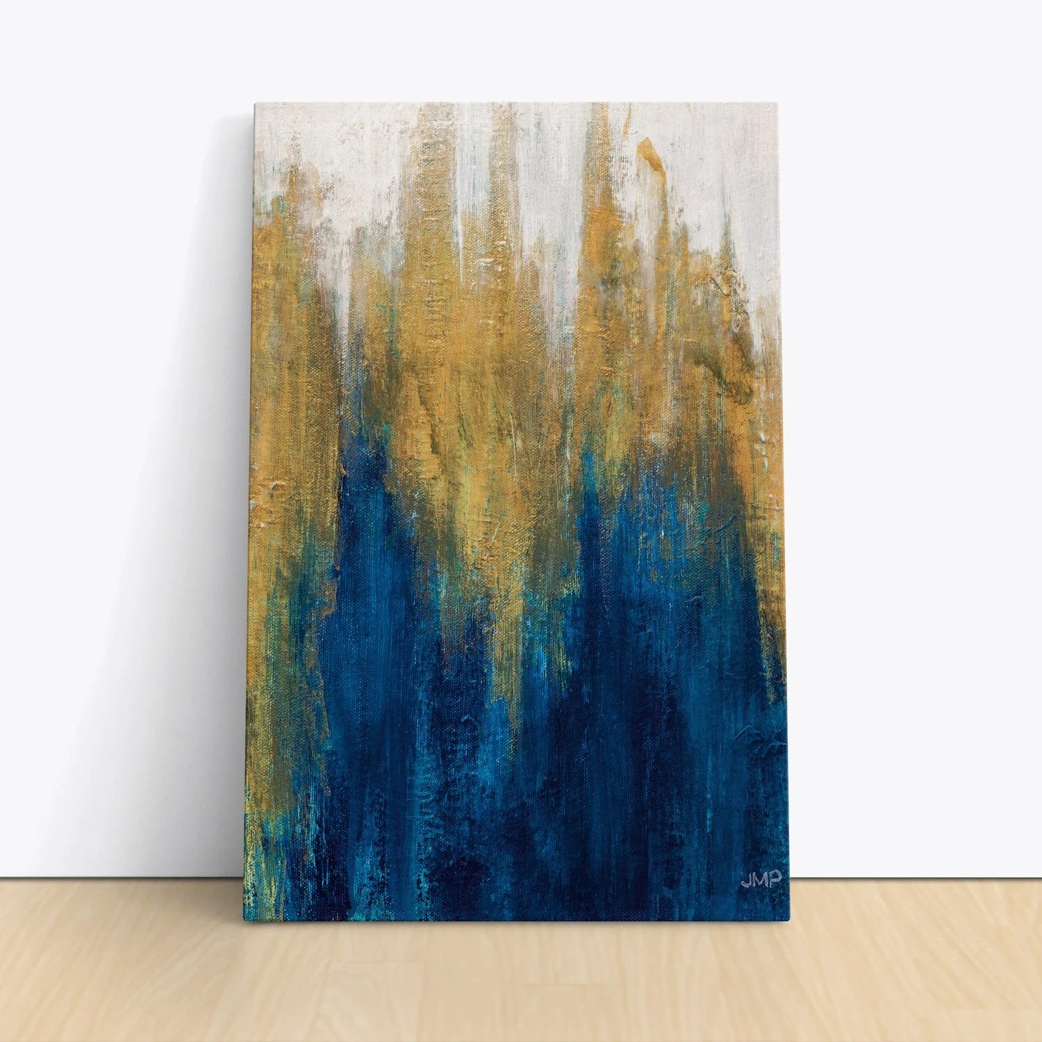 The composition begins with lighter, almost white tones at the top, transitioning smoothly into textured golds that descend and merge with the deep blues towards the bottom. The play of light and color in “Glimmer II” creates an impression of shimmering, cascading elements, evoking a sense of both tranquility and energy. The texture and depth of the piece draw the viewer in, making it a stunning and mesmerizing addition to any space.