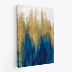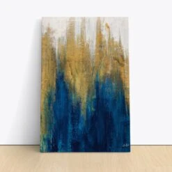 The canvas art print by Julia Purinton titled “Glimmer II” continues the vibrant and dynamic abstract theme of its predecessor. This artwork features a captivating blend of deep blues and rich golds, with the colors interacting in a way that suggests fluid motion.