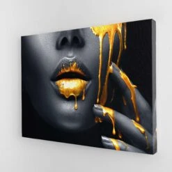 This beautiful, high-quality canvas art print is a unique piece of home décor. It features a perfectly contoured female face with gold dripping down her cheeks and lips. This gorgeous piece of wall art is perfect for any room or office, and will be a great conversation starter.