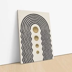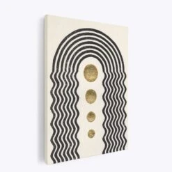 The Good Vibrations I Canvas Print by Moira Hershey is a stunning abstract line art piece. The print features bold black lines and metallic gold circles against a creamy background, creating a mesmerizing arch-like design. The metallic gold accents add a touch of mid-century modern elegance, making it the perfect addition to any millennial-inspired home décor. This canvas print is sure to be a conversation starter in any room.