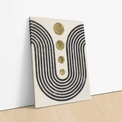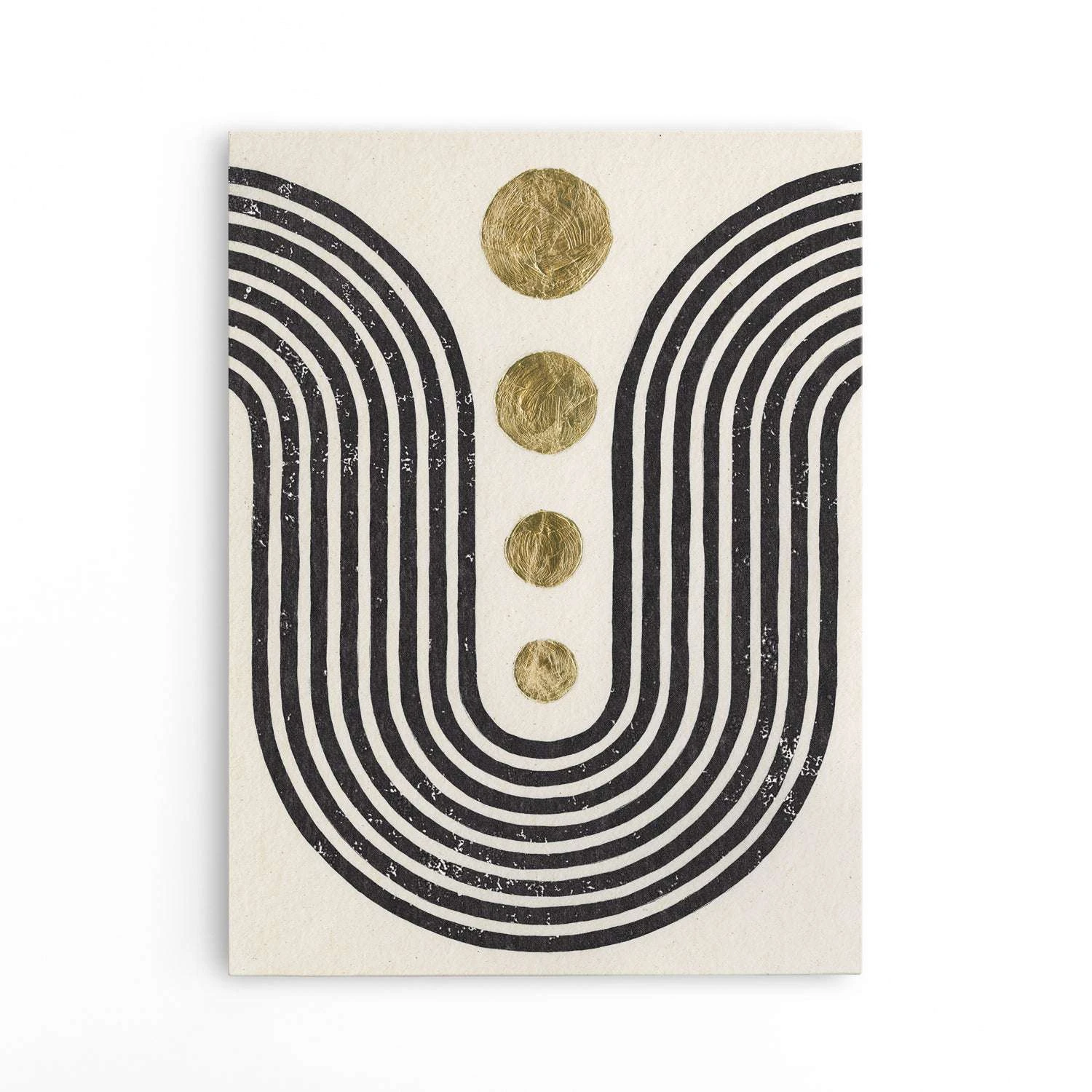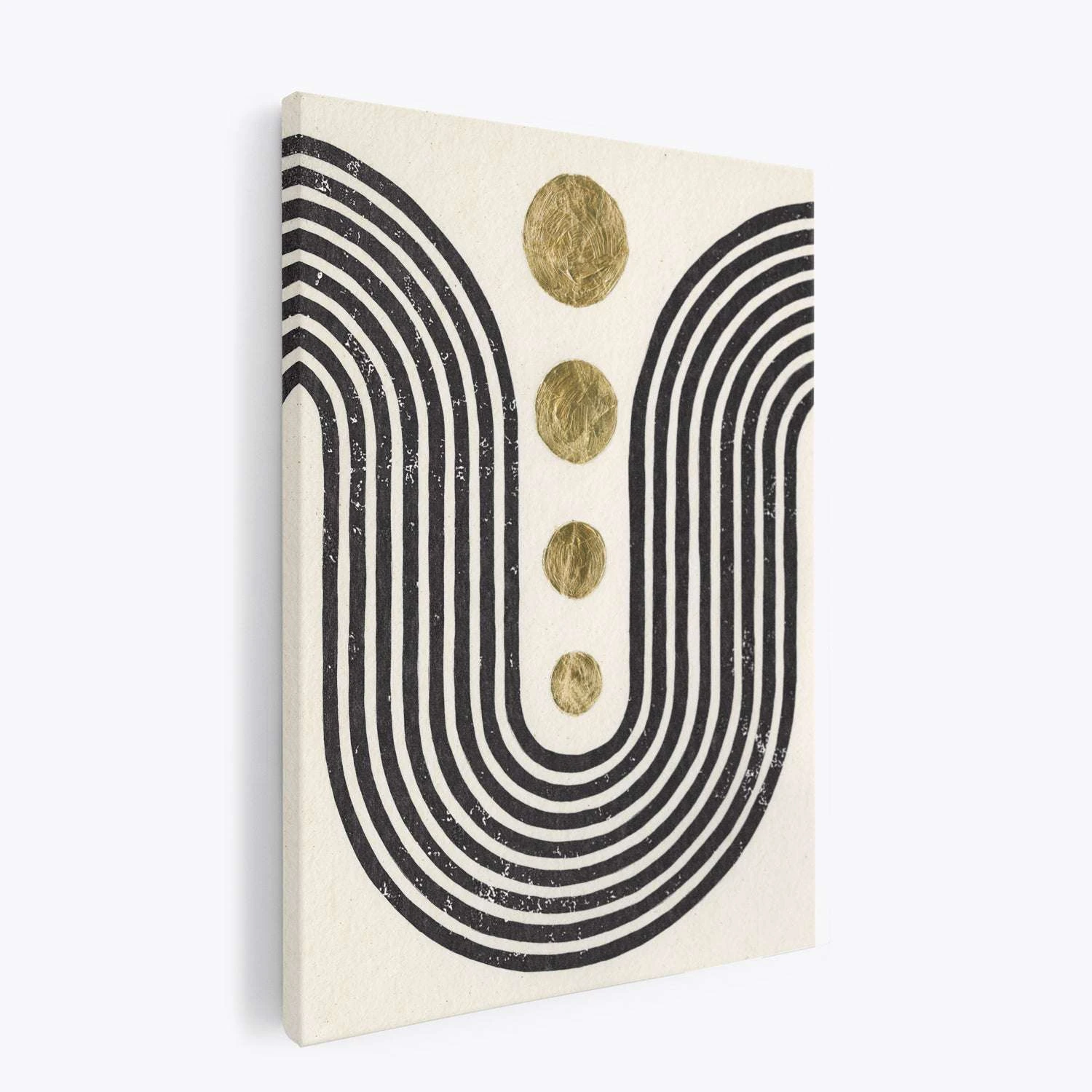 The Good Vibrations II Canvas Print by Moira Hershey is a stunning abstract line art piece. The print features bold black lines and metallic gold circles against a creamy background, creating a mesmerizing arch-like design. The metallic gold accents add a touch of mid-century modern elegance, making it the perfect addition to any millennial-inspired home décor. This canvas print is sure to be a conversation starter in any room.