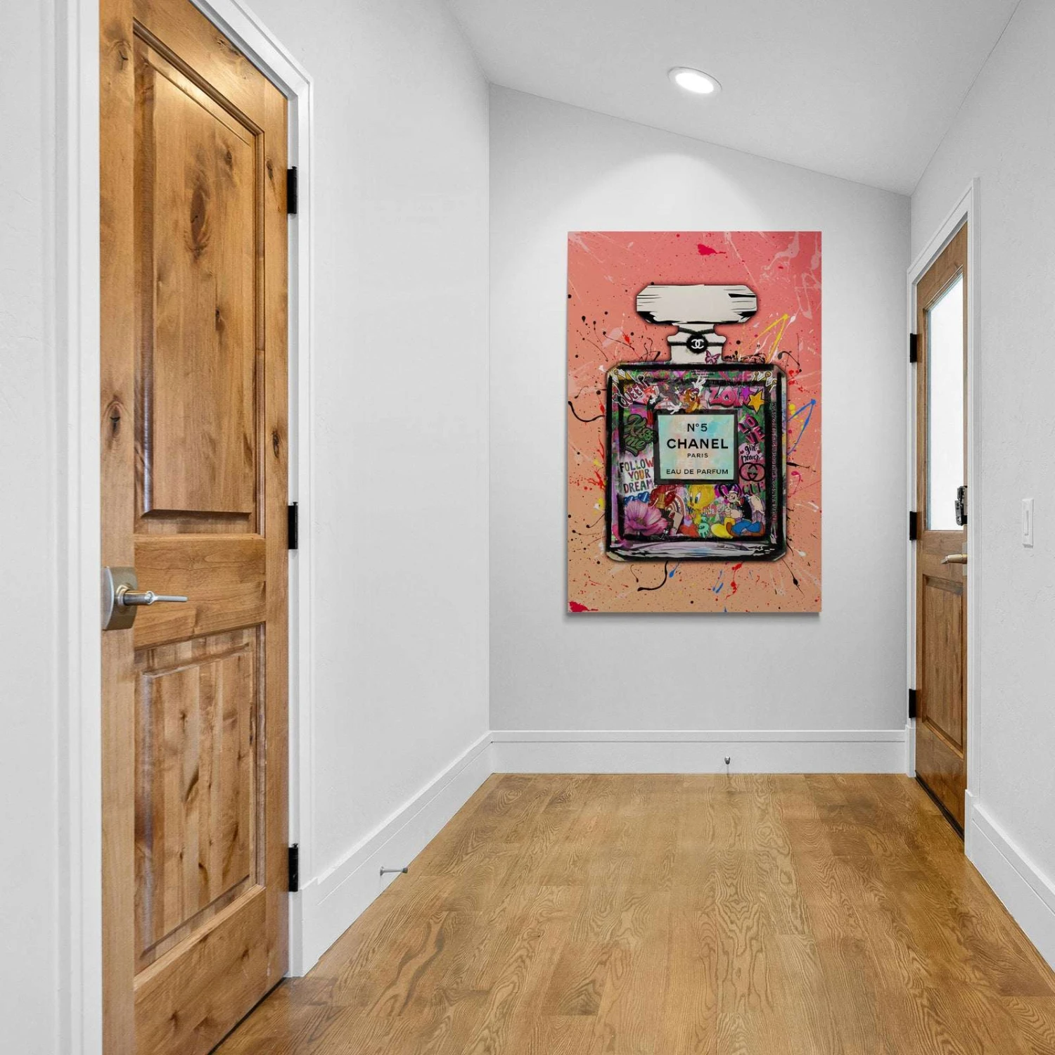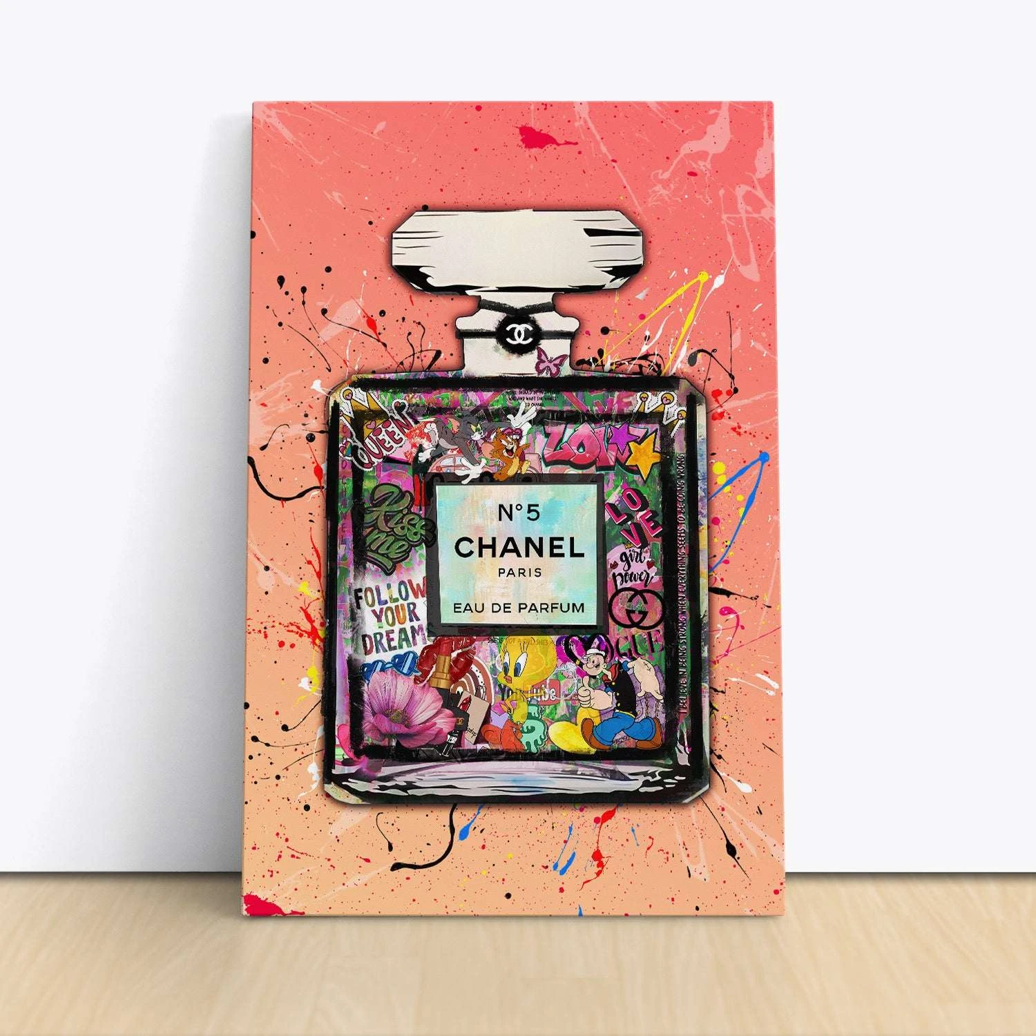 Introduce a bold statement to your space with the “Graffiti Chanel No 5 Canvas Wall Art in Pink.” This canvas art print showcases a vibrant and eclectic portrayal of the iconic Chanel No. 5 perfume bottle, set against a striking pink background with splashes of various colors. The artwork features dynamic graffiti elements and playful imagery, including motivational messages like “Follow Your Dream” and colorful cartoon characters, enhancing its pop art appeal. Perfect for contemporary décor, this visually captivating piece brings a touch of elegance and creativity, making it an ideal addition to any room.