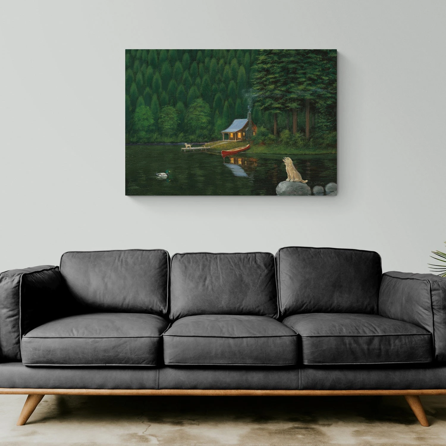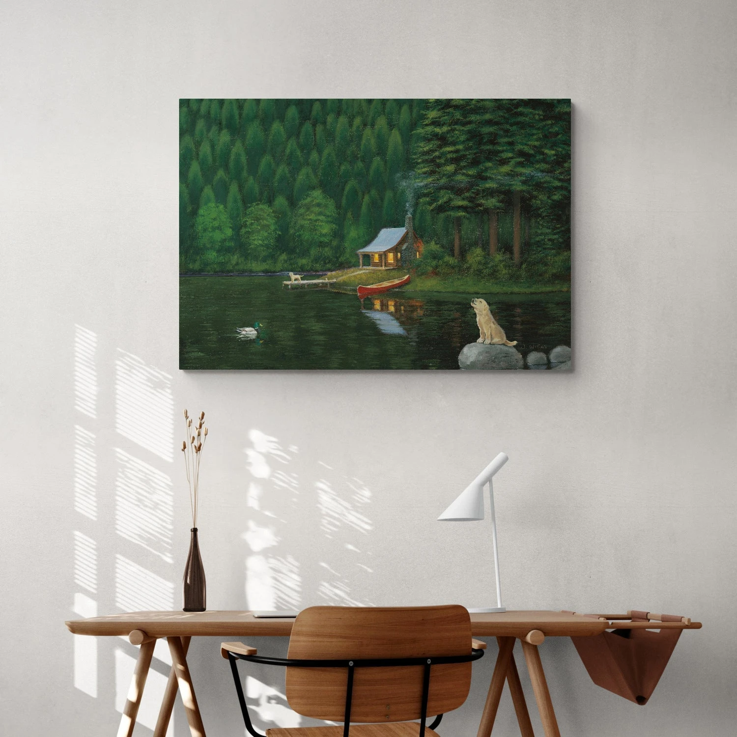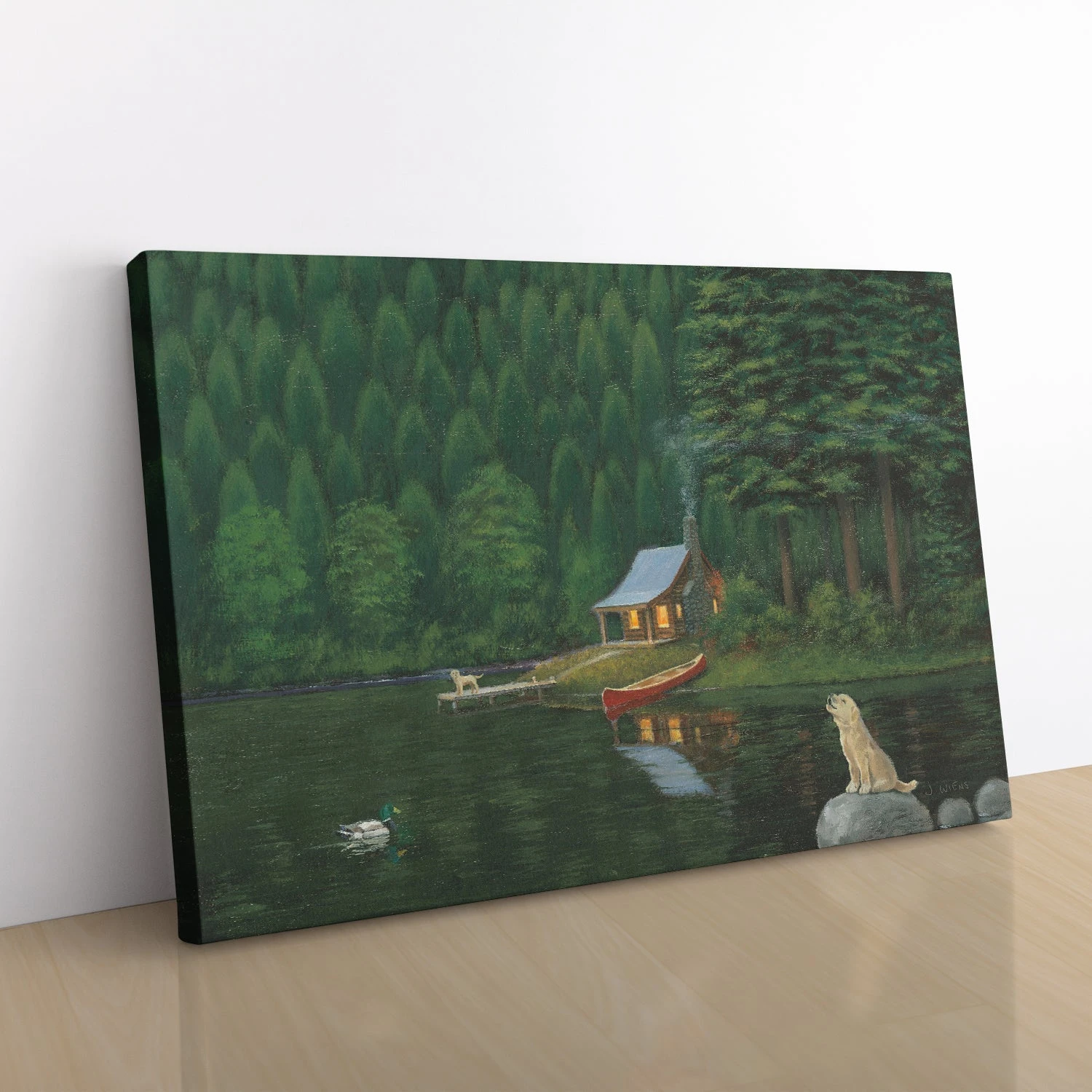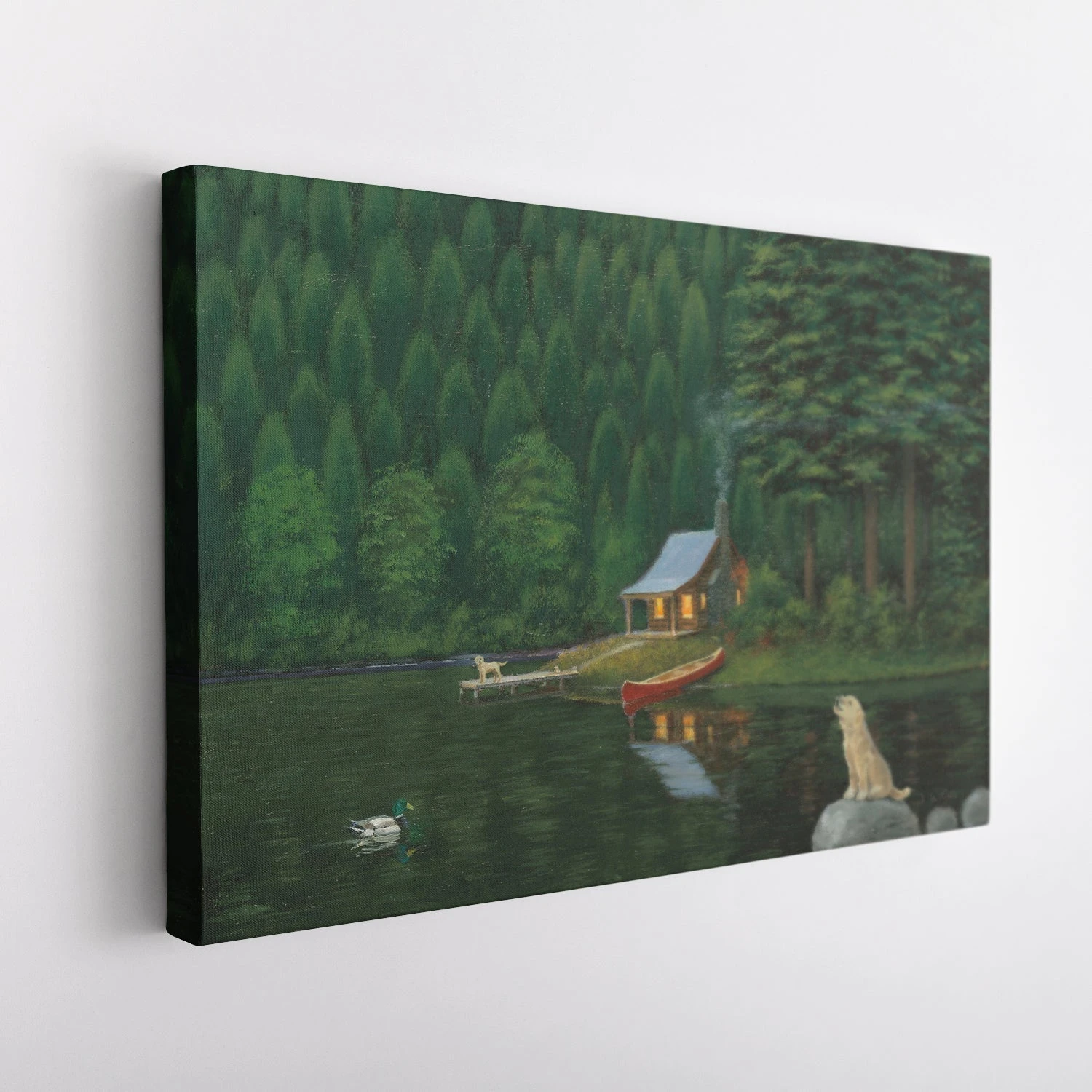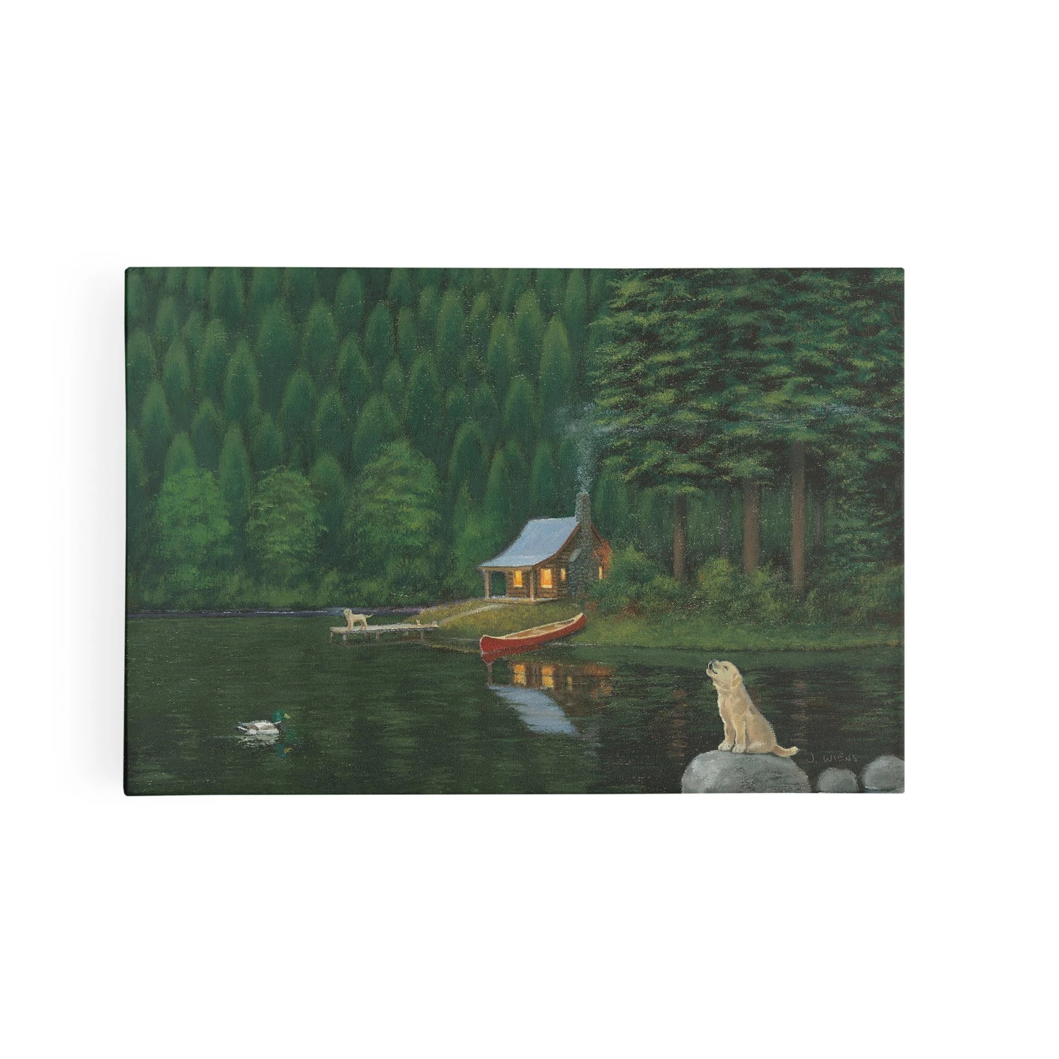 Happy Place II by James Wiens is a charming landscape canvas art print that beautifully captures the serenity of a lakeside cabin in the woods. The artwork features a cozy cabin illuminated from within, nestled among tall, dense trees and reflected on the still waters of the lake. A small canoe is docked at the shore, and a loyal dog sits on a nearby rock, adding to the peaceful and welcoming atmosphere. The rich, dark greens and warm yellow tones evoke a sense of calm and retreat.