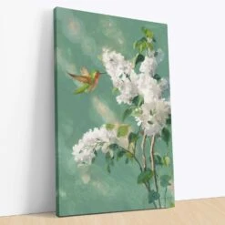 The hummingbird is rendered in stunning detail, with each feather and petal expertly painted. The flowers and florals that surround them are equally vibrant, with blooming petals in shades of lilac, white, and yellow. This piece is the perfect addition to any home or office, bringing a touch of springtime and the beauty of nature inside.