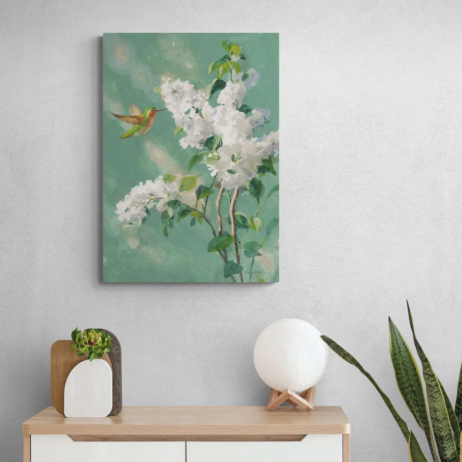 Hummingbird Spring by Danhui Nai is a breathtaking work of art that captures the magic and splendor of the season. Set against a backdrop of lush green foliage, the painting depicts a hummingbird as it flits and hovers among the blooming lilac bushes.