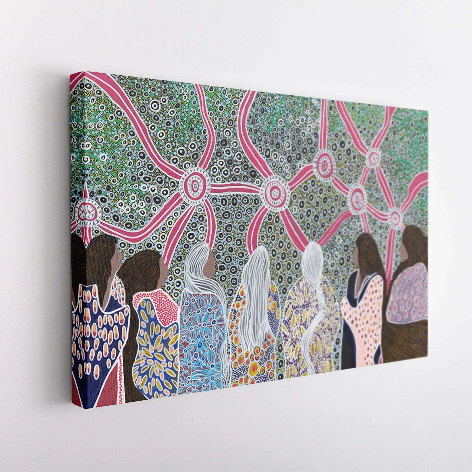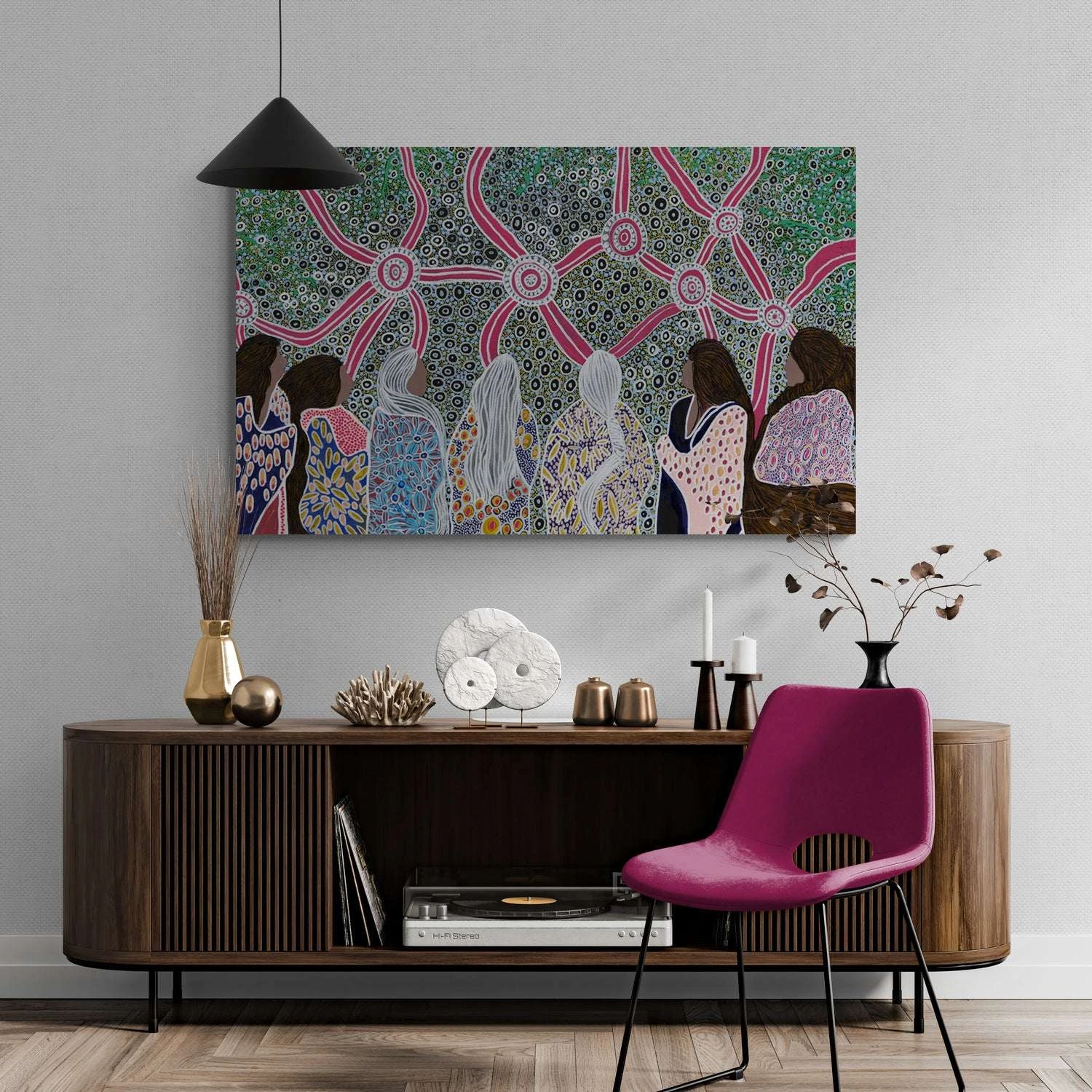 Julianne, born in Perth and of Whadjuk heritage through her mother, spent her formative years in Ngaruawahia Tainui, New Zealand, with her father’s side. She loves to create art using acrylics and natural colors, trying out different ways to express herself while keeping a connection to traditional culture. Her art journey officially started when she got into the WA Revealed Emerging Artist exhibition in 2020. With a background in education, Julianne is active in her community, using her art to talk about Aboriginal challenges and support positive changes.