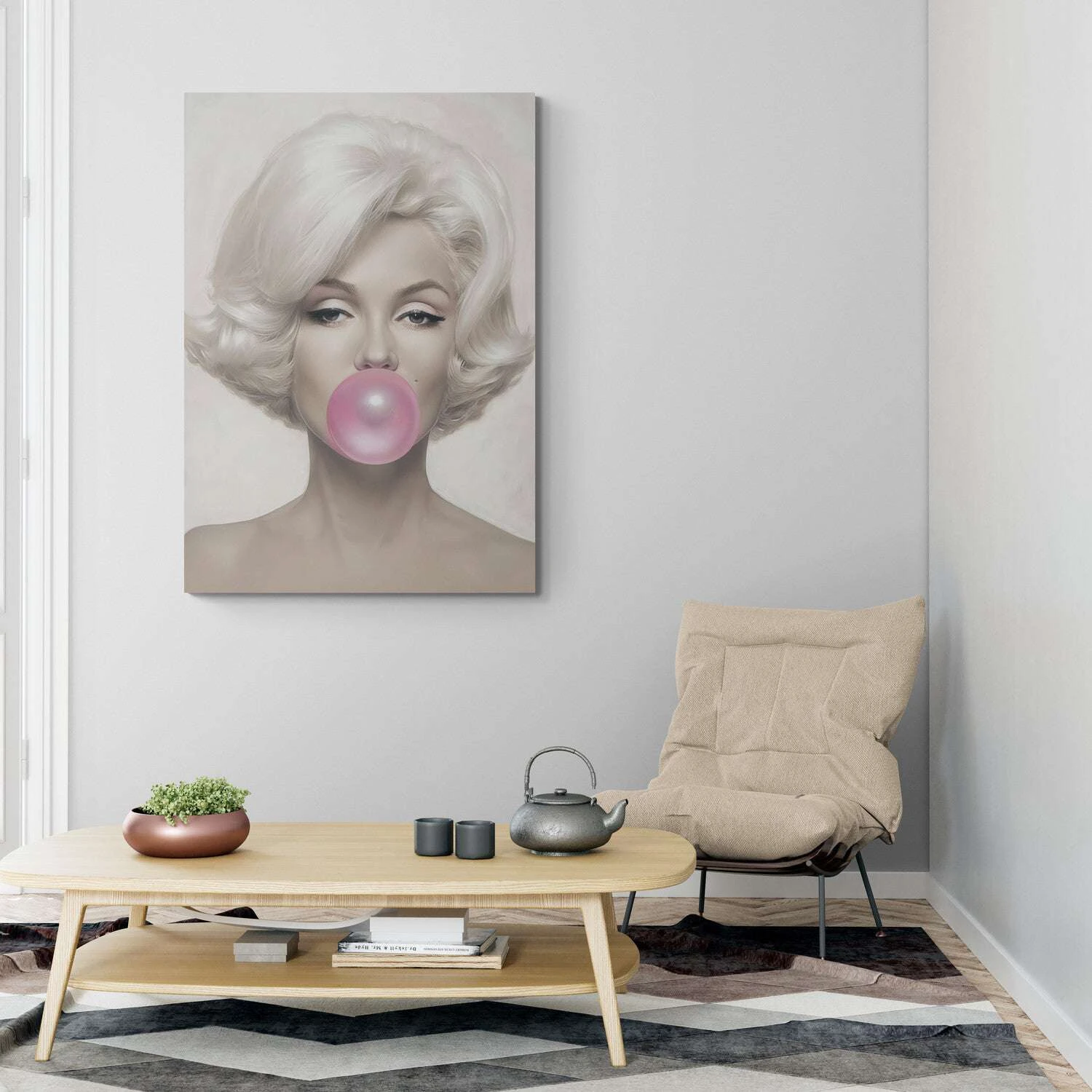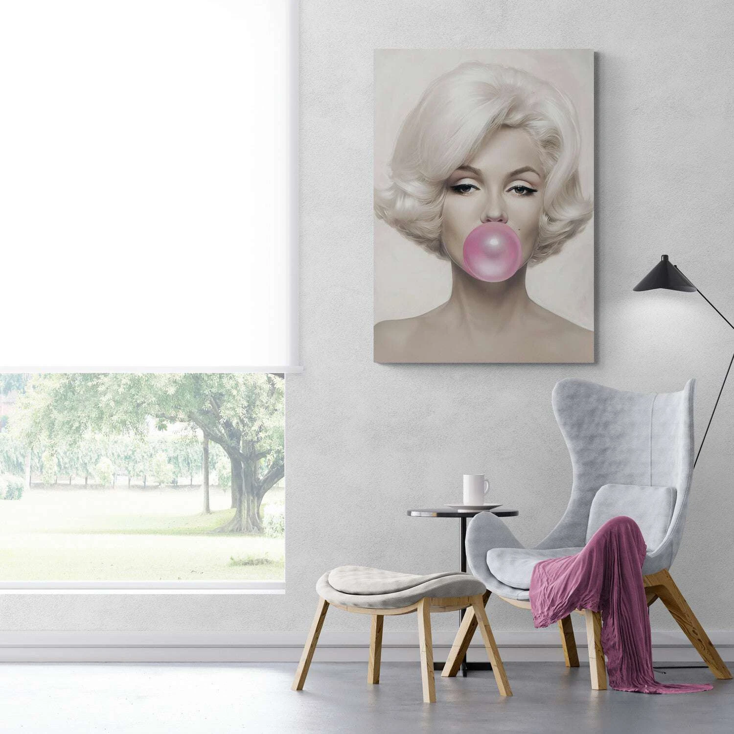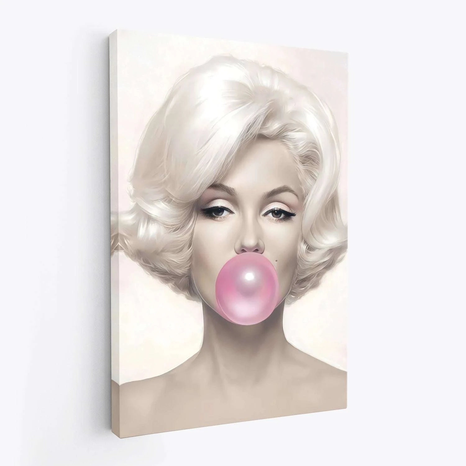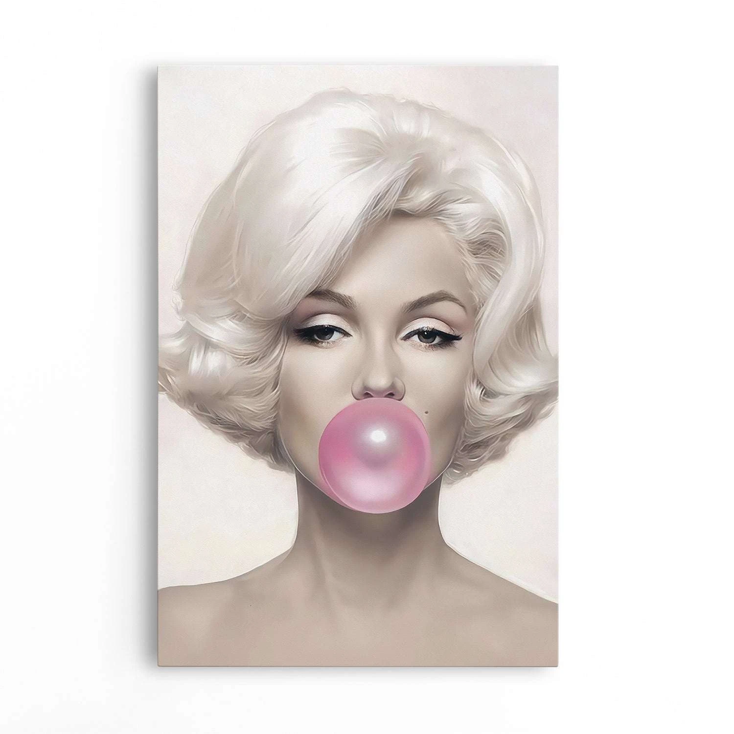 This exquisite print showcases the iconic Hollywood actress Marilyn Monroe in a playful and lighthearted pose, blowing a bubble of pink bubble gum.