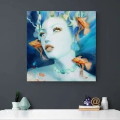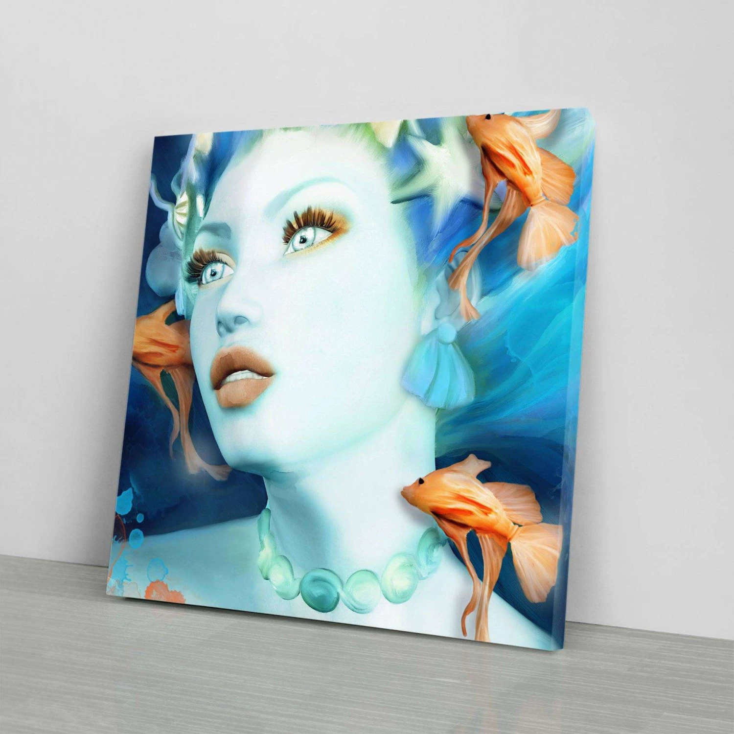 Dive deep with this beautiful mermaid in this delightful canvas art print! Featuring different shades of blue, this canvas is sure to delight.
