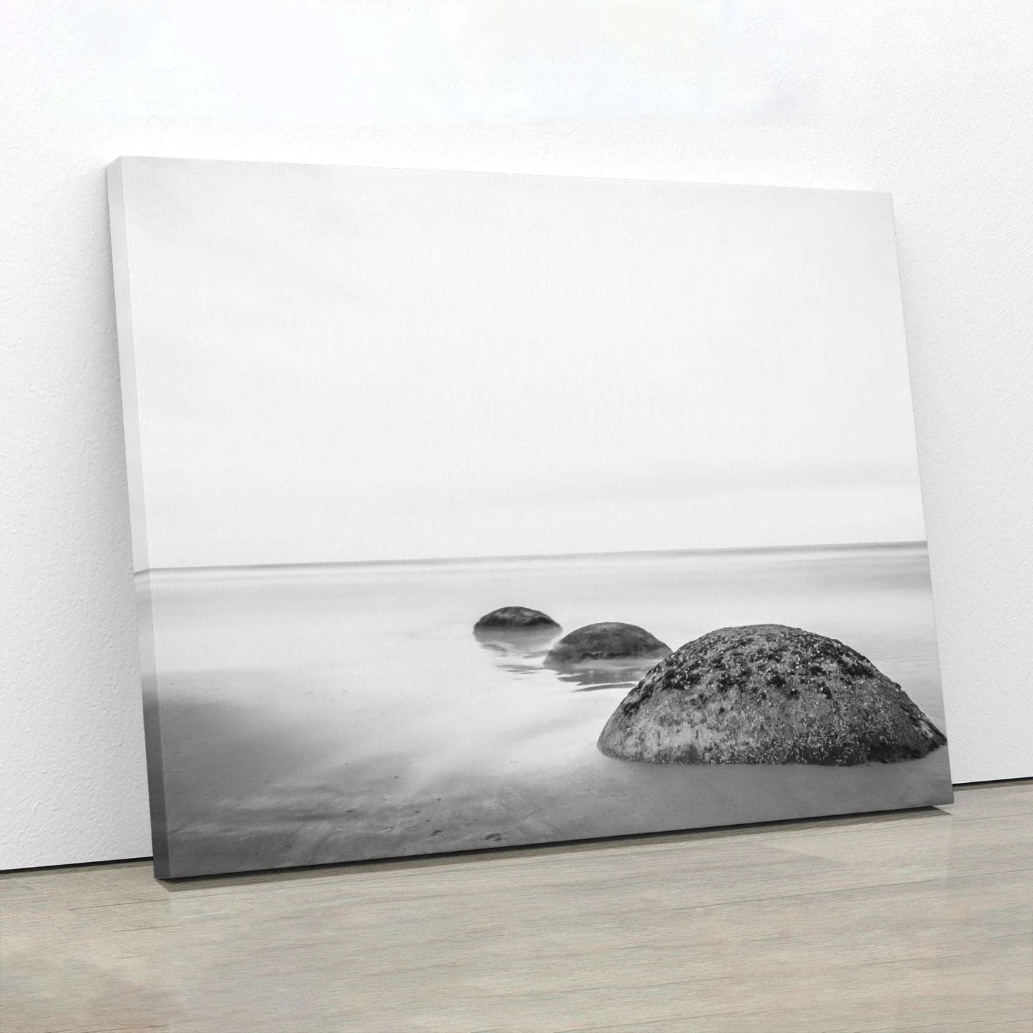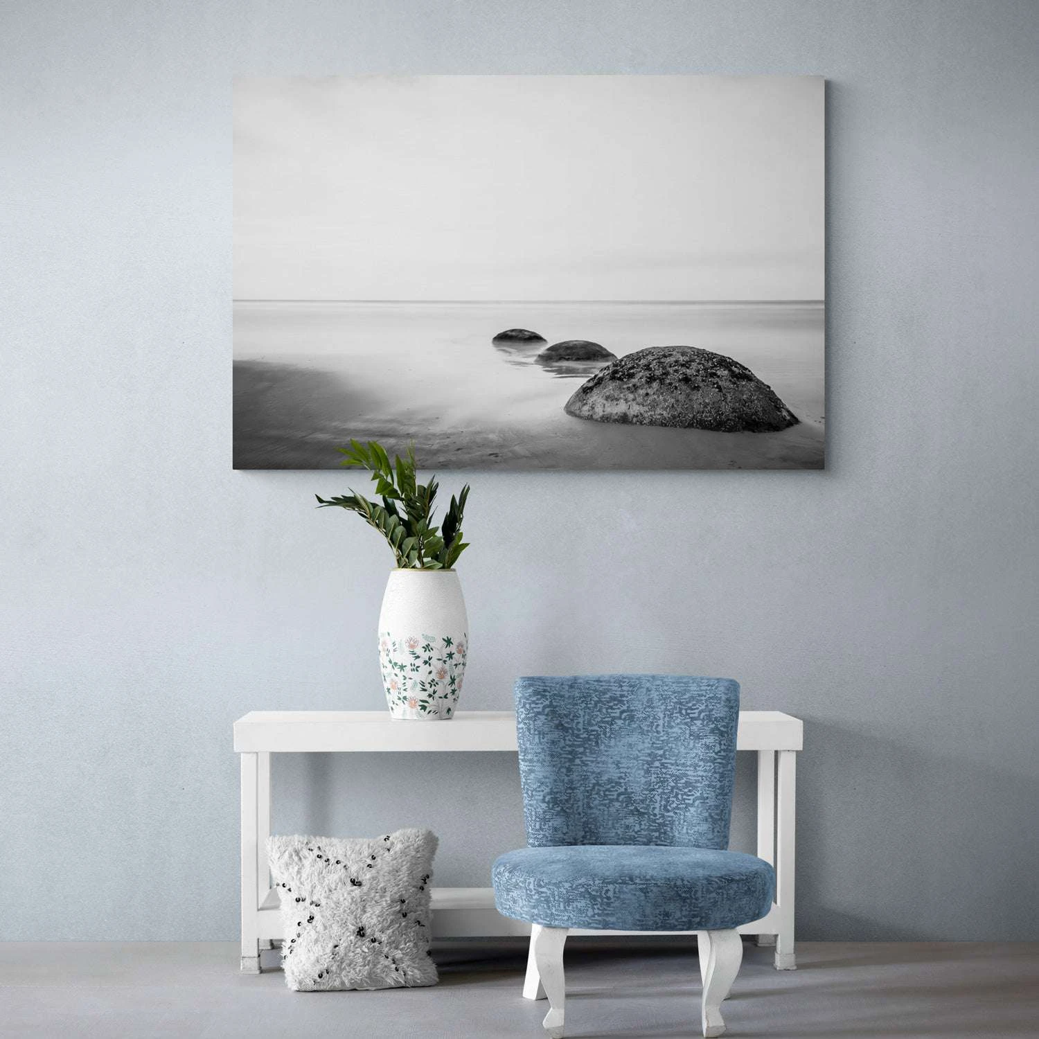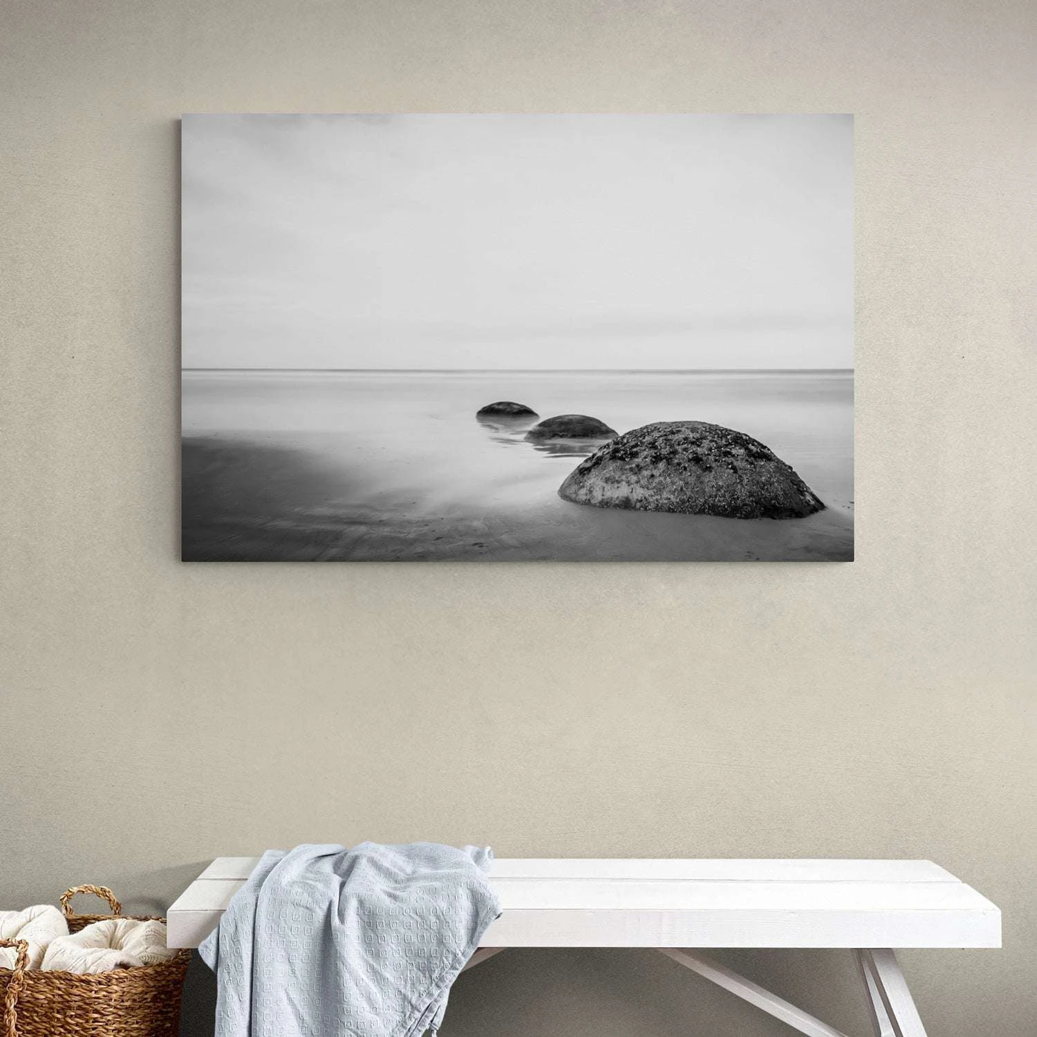 The Moeraki Boulders were created over 60 million years ago, and it’s even been said that they may have come from outer space. These rare geological wonders are found only near the beach of Moeraki, New Zealand. You can now make them a part of your home or office décor with this beautiful black and white canvas art print.