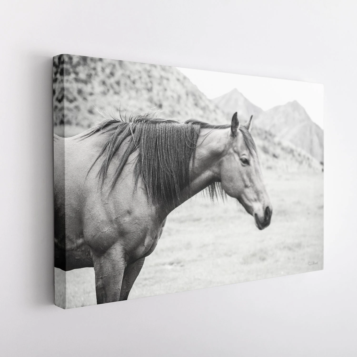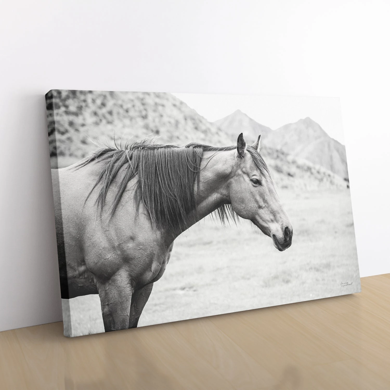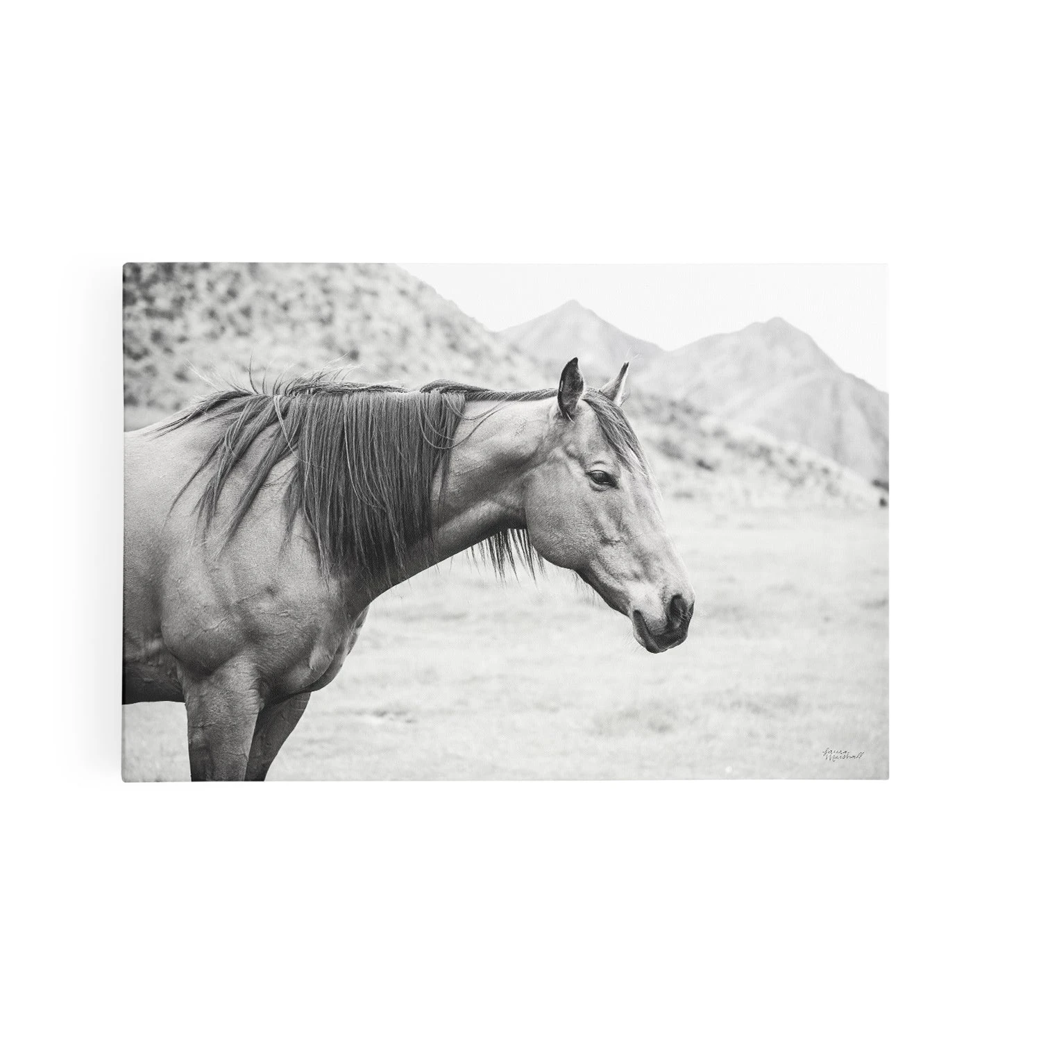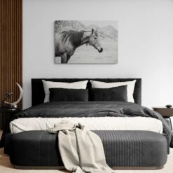 Experience the majestic beauty and serene presence of wild horses with “Moke Lake Horses,” a stunning black-and-white canvas art print by talented photographer Laura Marshall. Captured with an eye for detail and a heart for nature, this photograph presents a tranquil scene of a lone horse standing gracefully against the backdrop of the rugged Moke Lake landscape.