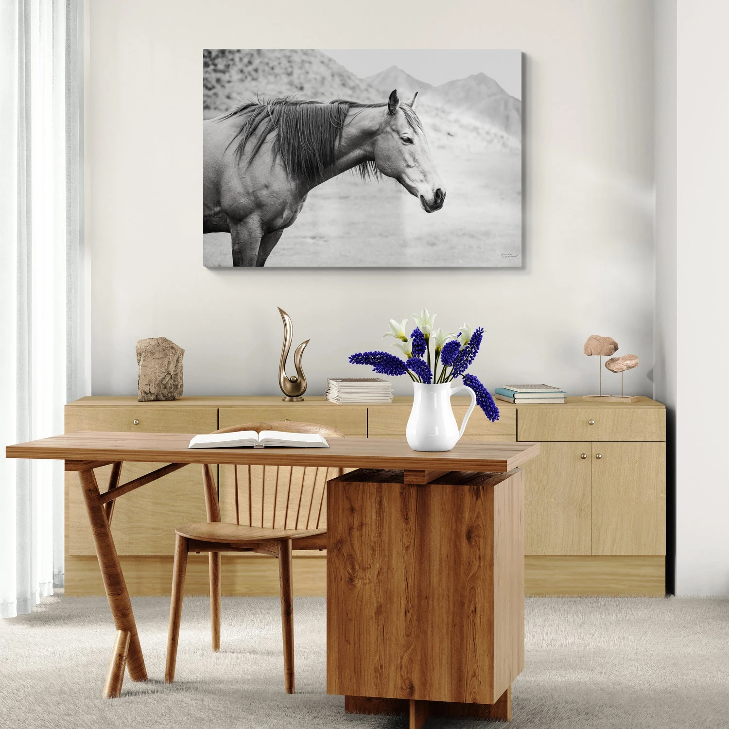 “Moke Lake Horses” by Laura Marshall is an evocative addition to your home or office decor. Its serene and powerful imagery invites contemplation and admiration, making it a captivating focal point in any room.