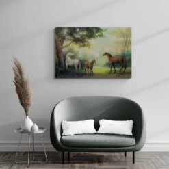 Near the Pasture by Julia Purinton is a serene, pastoral painting that captures the quiet beauty of nature and the gentle presence of horses. This canvas artwork depicts three horses standing peacefully near the edge of a lush pasture, surrounded by towering trees and soft sunlight filtering through the greenery. The warm, earthy tones and the calming, natural scenery bring a sense of tranquility to any space.