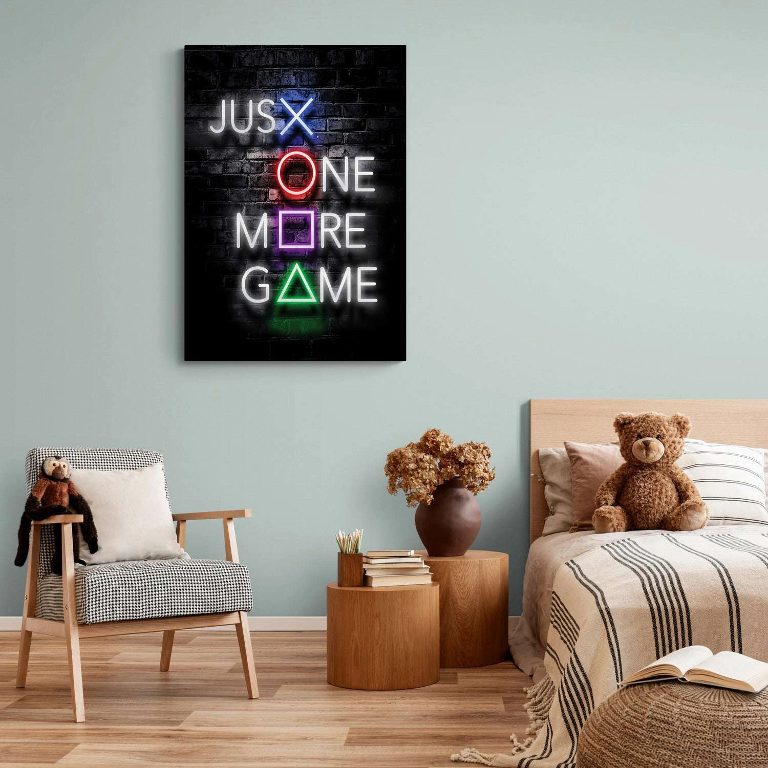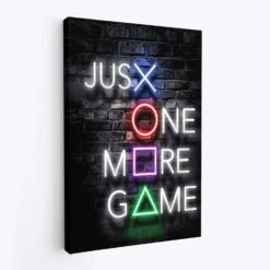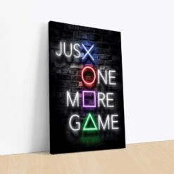 You won’t be able to put it down! This canvas art features One More Game text on a black brick background with neon highlights. It’s perfect for the gamer in your home, and arrives ready to hang, with hanging accessories included and no additional framing required.