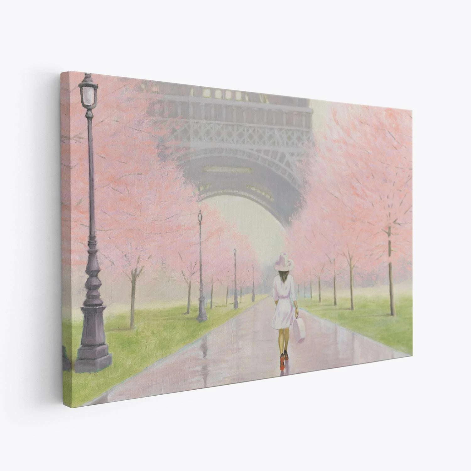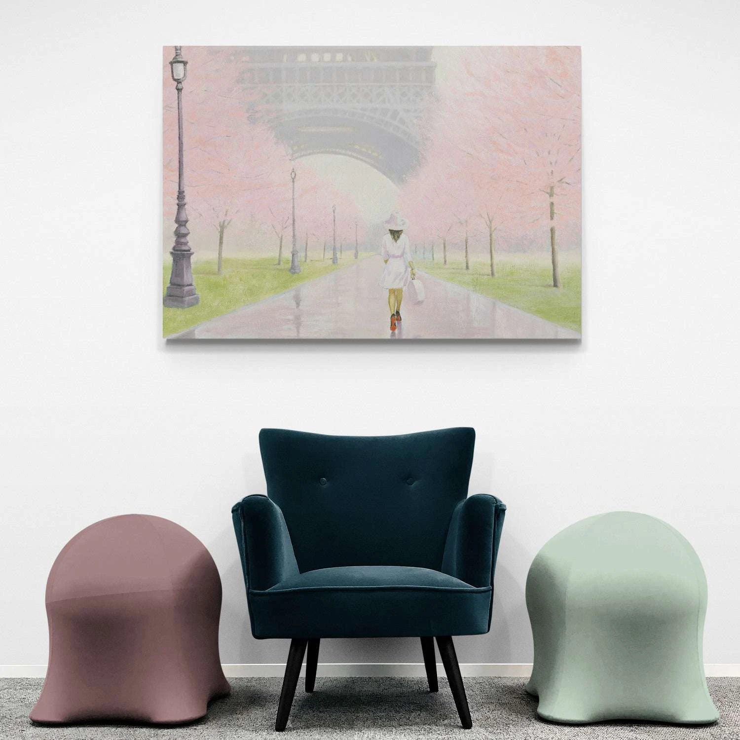 Printemps a Paris I by Marco Fabiano. Soft pinks and greens invoke a feeling of springtime in Paris. The woman walking in the park is carefree. The Eiffel tower, an iconic Parisian landmark, also makes this artwork stand out. Perfect for any room, it will make anyone who sees it feel happy and relaxed.
