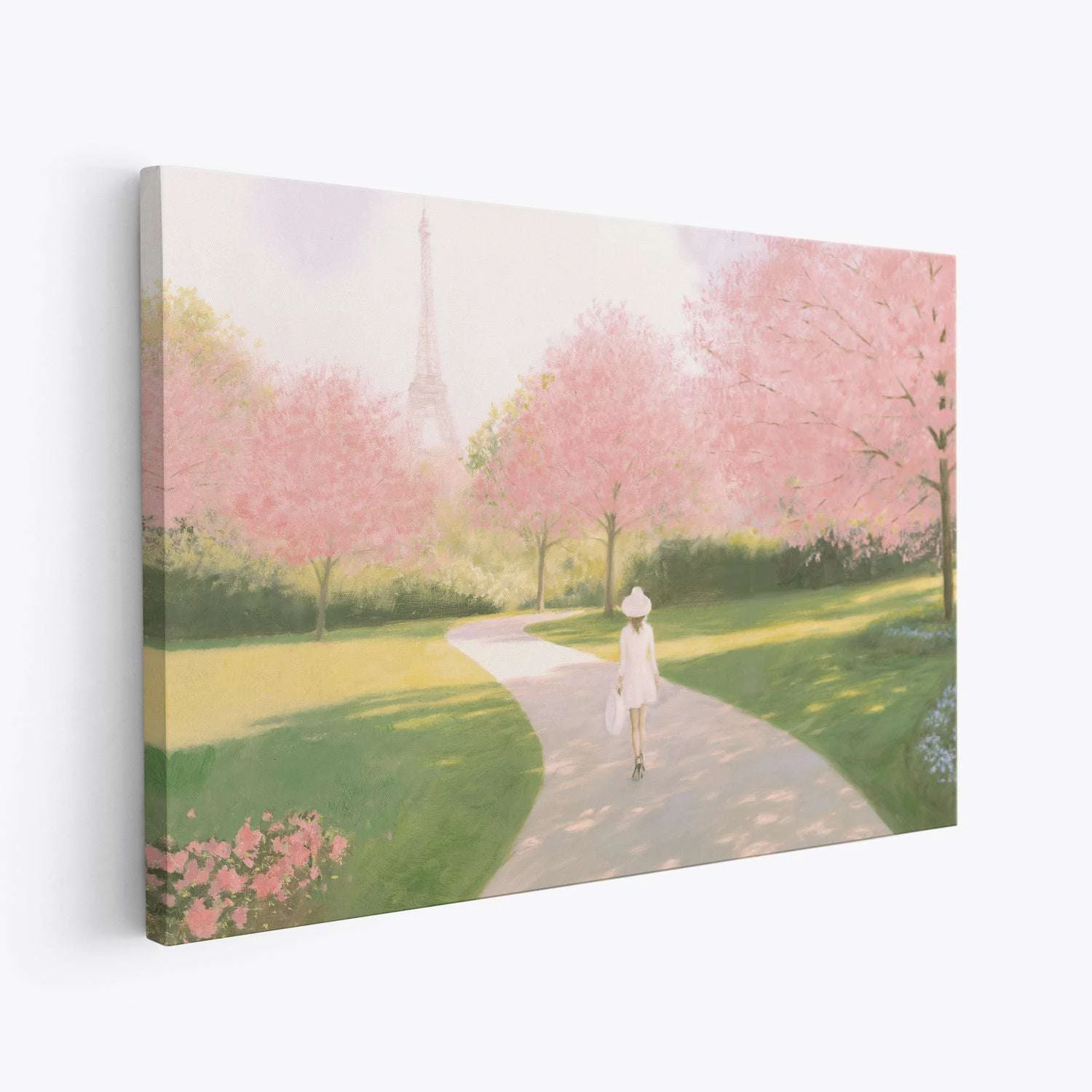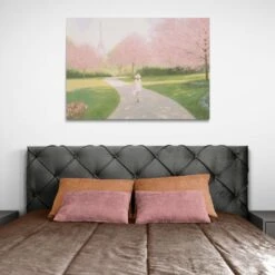 Printemps a Paris II by Marco Fabiano. Soft pinks and greens invoke a feeling of springtime in Paris. The woman walking in the park is carefree. The Eiffel tower, an iconic Parisian landmark, also makes this artwork stand out. Perfect for any room, it will make anyone who sees it feel happy and relaxed.