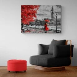This canvas print features a captivating black and white design, with the iconic Big Ben clock tower in the background. In the foreground, a couple is captured in a tender kiss, holding a red umbrella, while a tree in the foreground is also featured in red, making it a prominent figure in the piece.