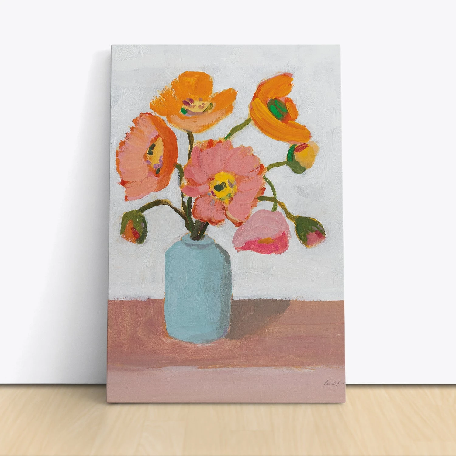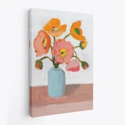 Sorbet Poppies II by Pamela Munger is a delightful floral canvas art print that showcases the lively beauty of blooming poppies. The vibrant artwork features bold strokes of orange, pink, and yellow poppies in a light blue vase, set against a soft, neutral background. This cheerful composition brings a sense of joy and freshness, making it a perfect piece to brighten up any room.
