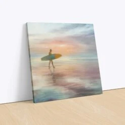 Surfside by Danhui Nai. Get ready to hang this print on your wall and transform your room into a perfect escape. The serene and beautiful colours will keep you calm, with the man ready to surf reminding you of the upcoming weekend.