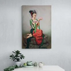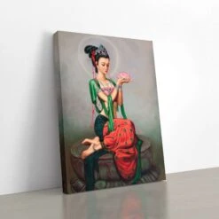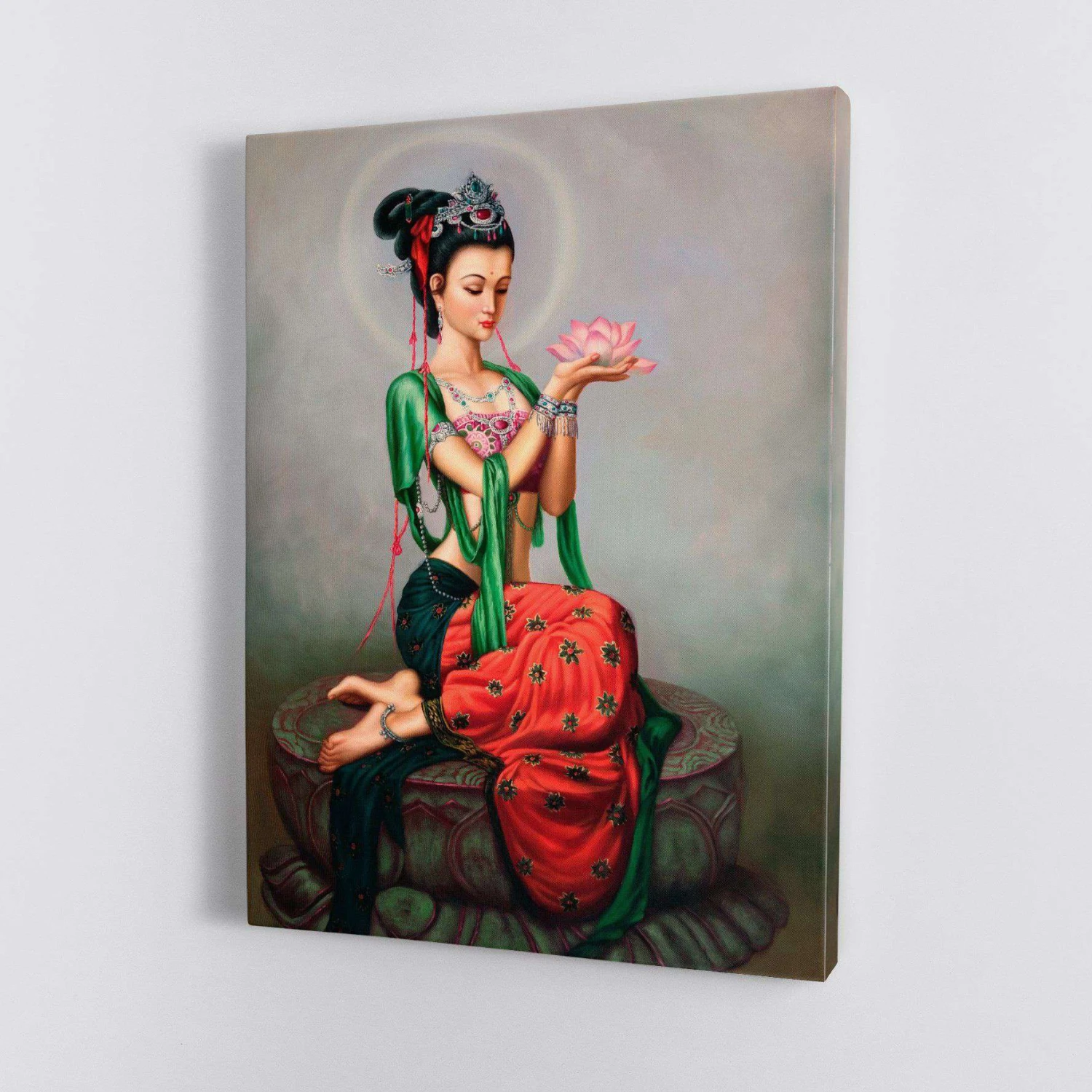 Add a touch of romance, glamour, and beauty to your space with this canvas art print featuring a young lady delicately holding a lotus flower.