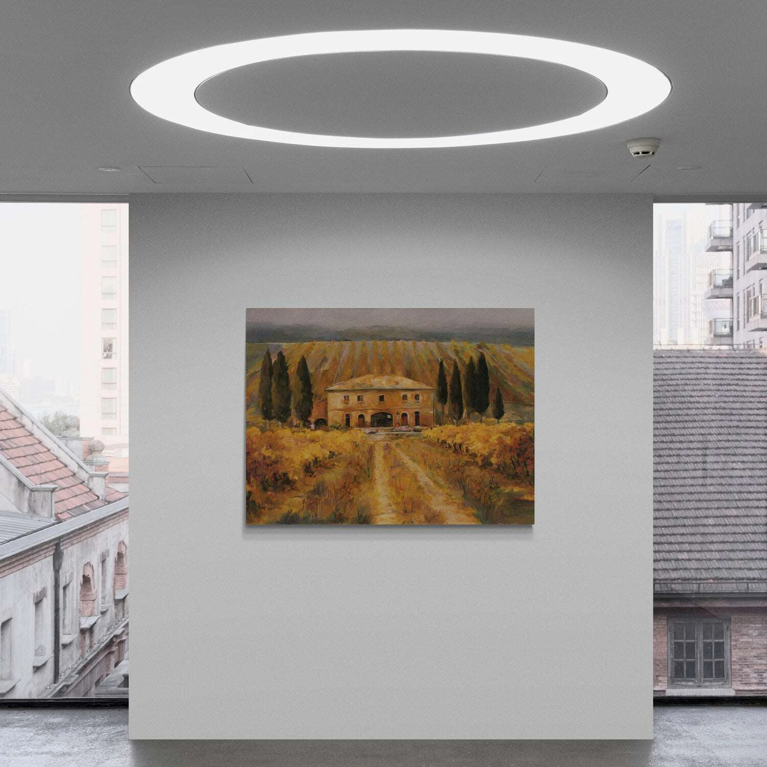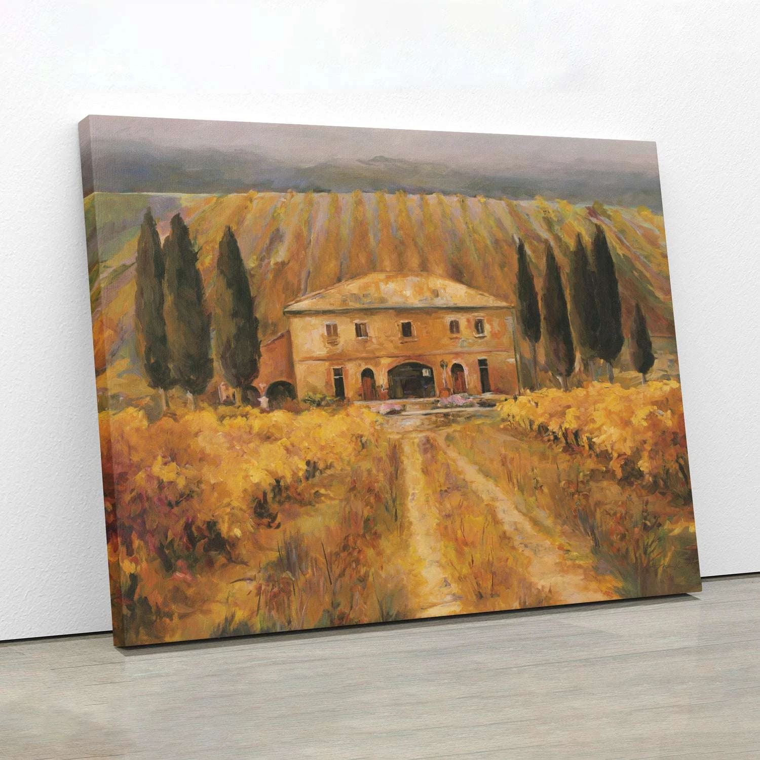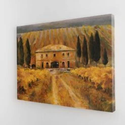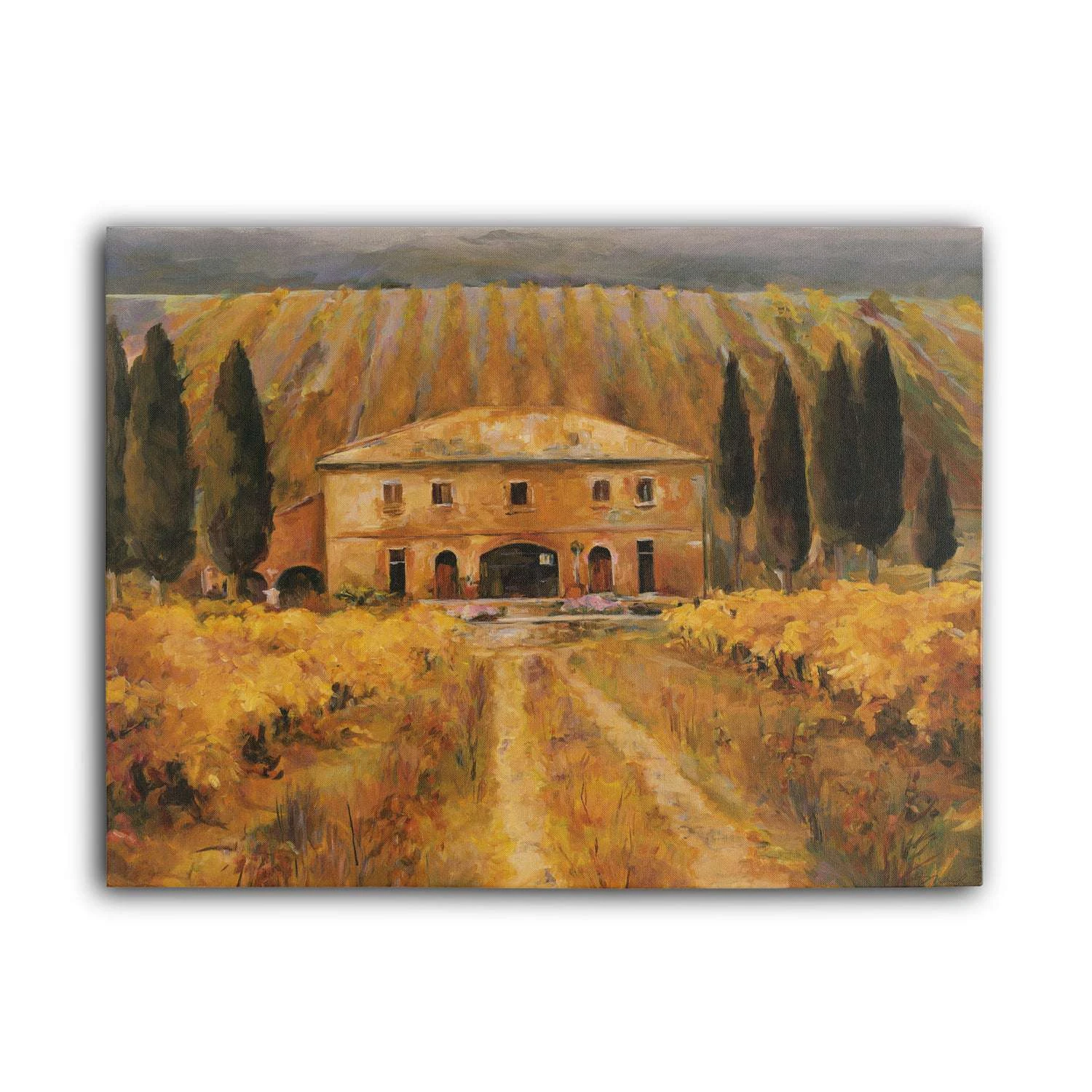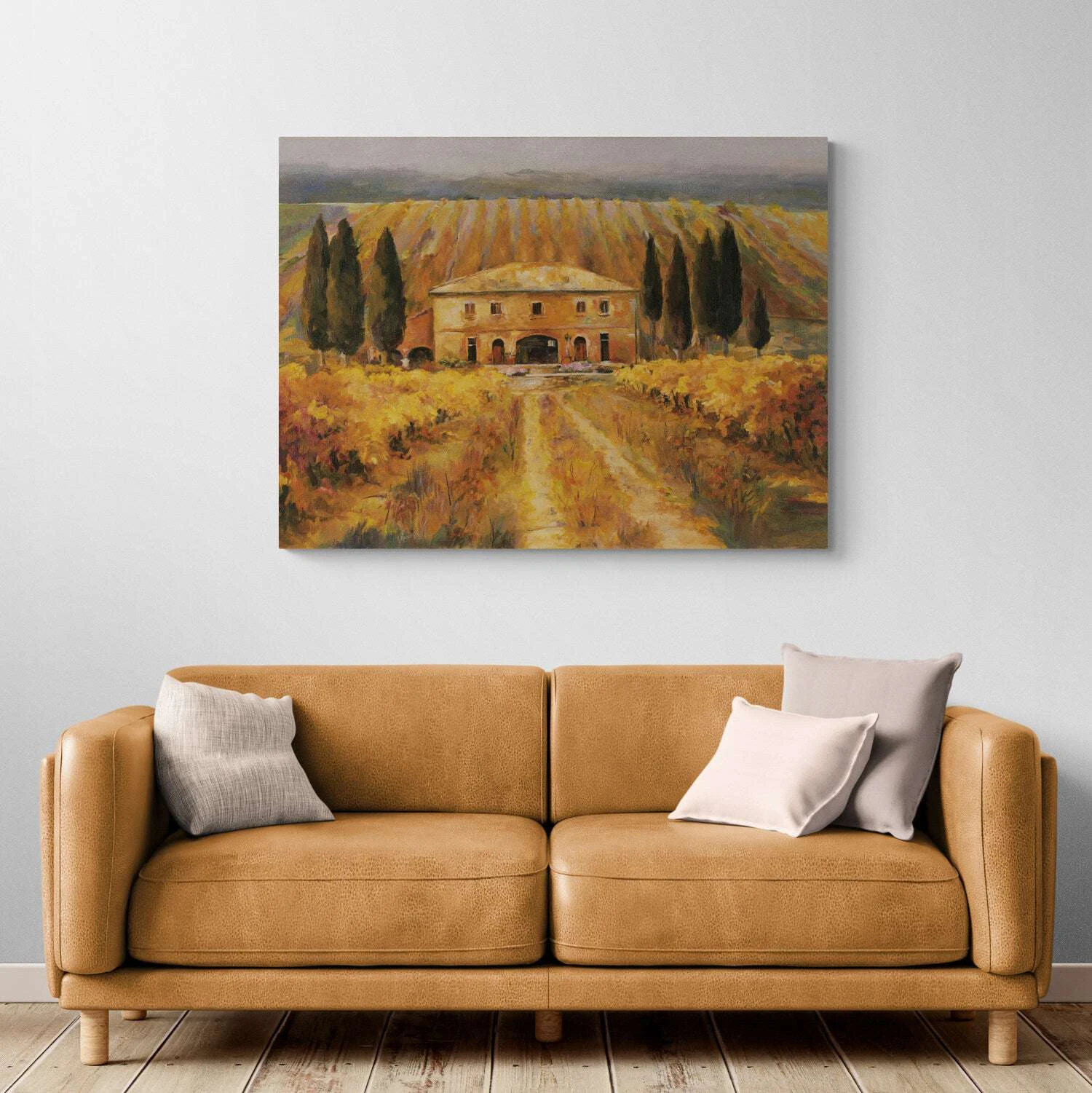 This vineyard painting by Marilyn Hageman is a contemporary work of art that depicts an Italian vineyard. The Ochre hues create a rich, warm feel to the Tuscany landscape. This print is an excellent choice for any wine lover who appreciates the beauty of Tuscany.
